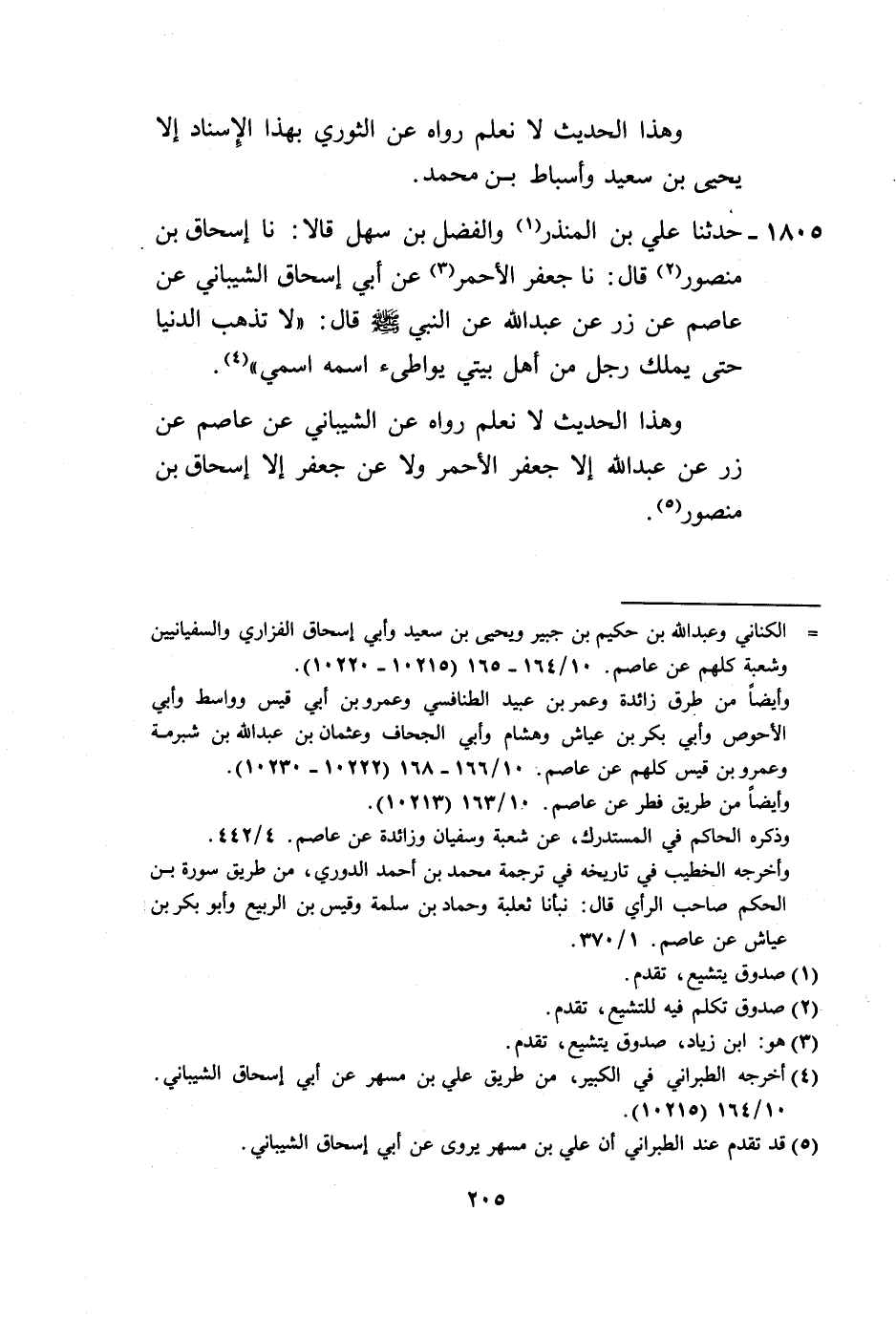 1805 - حَدَّثَنَا عَلِيُّ بْنُ الْمُنْذِرِ، وَالْفَضْلُ بْنُ سَهْلٍ، قَالَا: نا إِسْحَاقُ بْنُ مَنْصُورٍ، قَالَ: نا جَعْفَرُ الْأَحْمَرُ، عَنْ أَبِي إِسْحَاقَ الشَّيْبَانِيِّ، عَنْ عَاصِمٍ، عَنْ زِرٍّ، عَنْ عَبْدِ اللَّهِ، عَنِ النَّبِيِّ صَلَّى اللهُ عَلَيْهِ وَسَلَّمَ قَالَ: «§لَا تَذْهَبُ الدُّنْيَا حَتَّى يَمْلِكَ رَجُلٌ مِنْ أَهْلِ بَيْتِي يُوَاطِئُ اسْمُهُ اسْمِي» ، وَهَذَا الْحَدِيثُ لَا نَعْلَمُ رَوَاهُ عَنِ الشَّيْبَانِيِّ، عَنْ عَاصِمٍ، عَنْ زِرٍّ، عَنْ عَبْدِ اللَّهِ إِلَّا جَعْفَرٌ الْأَحْمَرُ، وَلَا عَنْ جَعْفَرٍ إِلَّا إِسْحَاقُ بْنُ مَنْصُورٍ -[206]-،