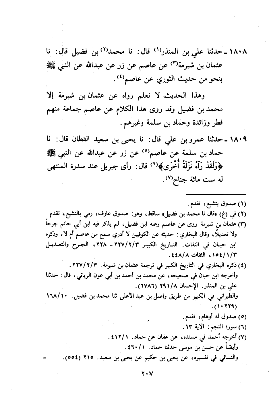 1809 - حَدَّثَنَا عَمْرُو بْنُ عَلِيٍّ، قَالَ: نا يَحْيَى بْنُ سَعِيدٍ الْقَطَّانُ، قَالَ: نَا حَمَّادُ بْنُ سَلَمَةَ، عَنْ عَاصِمٍ، عَنْ زِرٍّ، عَنْ عَبْدِ اللَّهِ، عَنِ النَّبِيِّ صَلَّى اللهُ عَلَيْهِ وَسَلَّمَ: {وَلَقَدْ رَآهُ نَزْلَةً أُخْرَى} [النجم: 13] ، قَالَ: «§رَأَى جِبْرِيلَ عِنْدَ سِدْرَةِ الْمُنْتَهَى لَهُ سِتُّ مِائَةِ جَنَاحٍ» -[208]-، وَهَذَا الْحَدِيثُ لَا نَعْلَمُ أَحَدًا قَالَ فِيهِ عَنِ النَّبِيِّ صَلَّى اللهُ عَلَيْهِ وَسَلَّمَ إِلَّا يَحْيَى بْنُ سَعِيدٍ، عَنْ حَمَّادٍ، وَقَدْ رَوَاهُ غَيْرُ يَحْيَى، عَنْ حَمَّادٍ، عَنْ عَاصِمٍ، عَنْ زِرٍّ، عَنْ عَبْدِ اللَّهِ مَوْقُوفًا