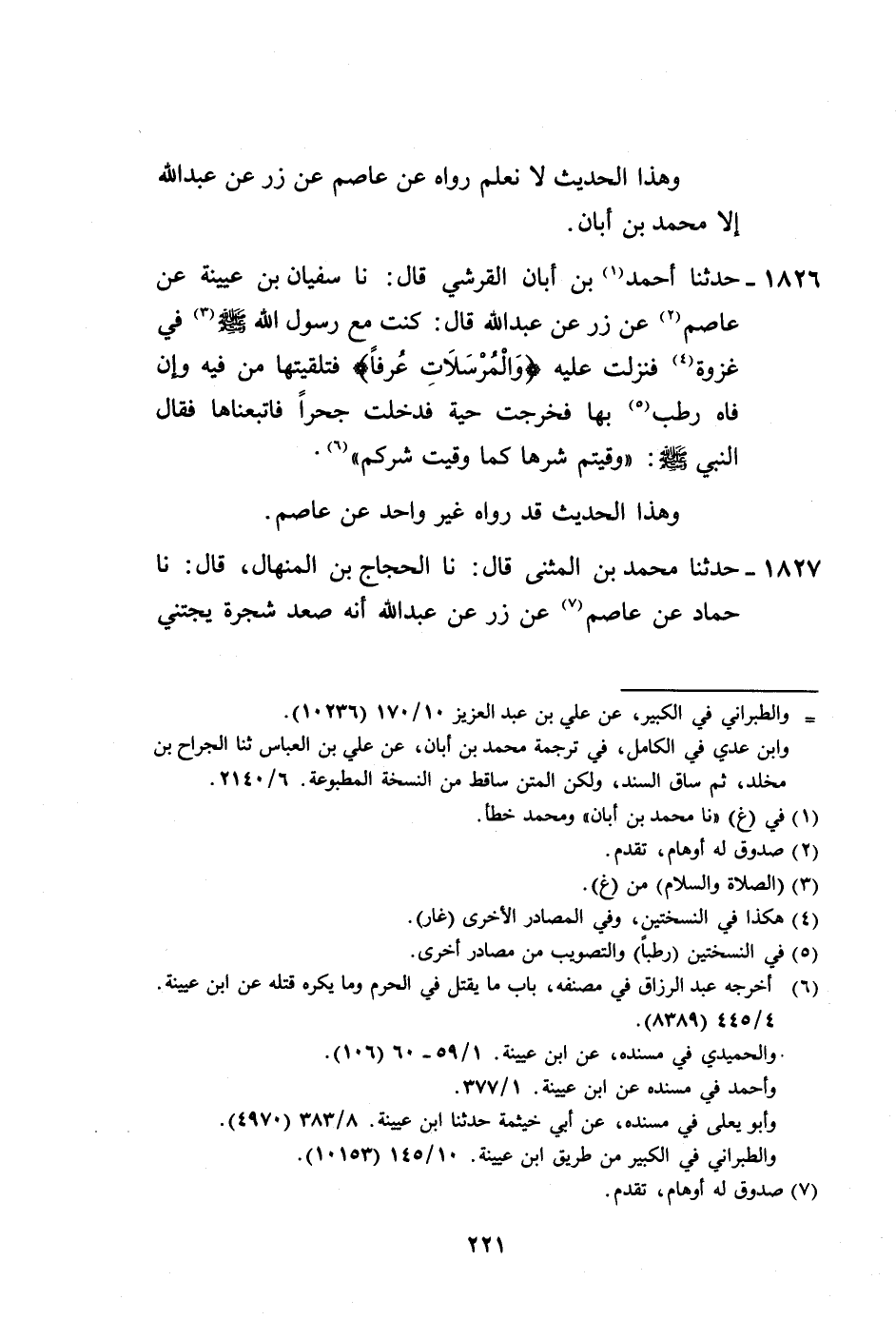 1826 - حَدَّثَنَا أَحْمَدُ بْنُ أَبَانَ الْقُرَشِيُّ، قَالَ: نا سُفْيَانُ بْنُ عُيَيْنَةَ، عَنْ عَاصِمٍ، عَنْ زِرٍّ، عَنْ عَبْدِ اللَّهِ، قَالَ: كُنْتُ مَعَ رَسُولِ اللَّهِ صَلَّى اللهُ عَلَيْهِ وَسَلَّمَ فِي غَزْوَةٍ فَنَزَلَتْ عَلَيْهِ وَالْمُرْسَلَاتِ عُرْفًا فَتَلَقَيْتُهَا مِنْ فِيهِ، وَإِنَّ فَاهُ رَطْبٌ بِهَا، فَخَرَجَتْ حَيَّةٌ فَدَخَلَتْ جُحْرًا فَاتَّبَعْنَاهَا، فَقَالَ النَّبِيُّ صَلَّى اللهُ عَلَيْهِ وَسَلَّمَ: «§وُقِيتُمْ شَرَّهَا كَمَا وُقِيَتْ شَرَّكُمْ» ، وَهَذَا الْحَدِيثُ قَدْ رَوَاهُ غَيْرُ وَاحِدٍ، عَنْ عَاصِمٍ