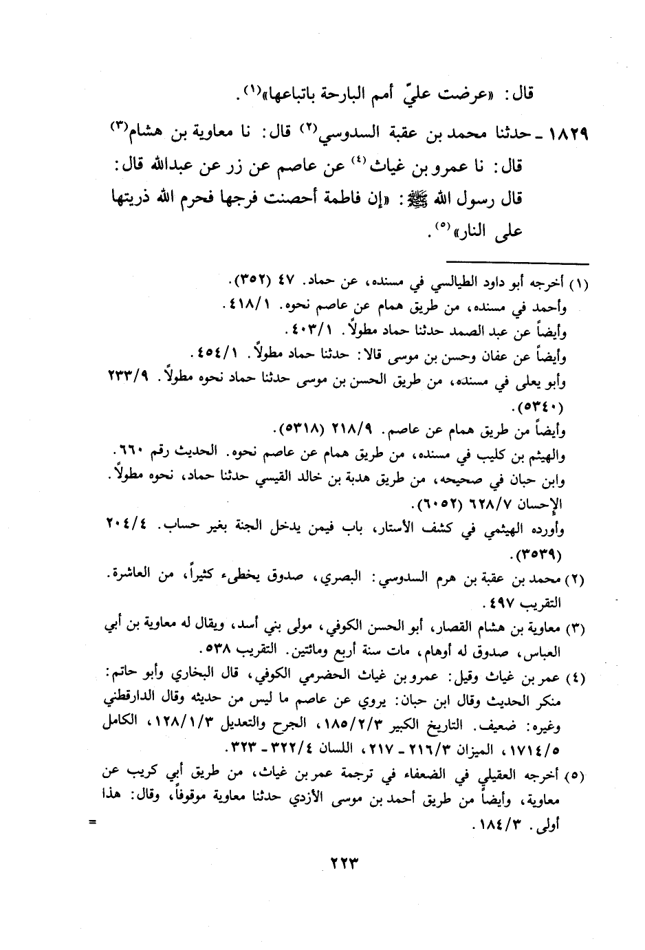 1829 - حَدَّثَنَا مُحَمَّدُ بْنُ عُقْبَةَ السَّدُوسِيُّ، قَالَ: نا مُعَاوِيَةُ بْنُ هِشَامٍ، قَالَ: نا عَمْرُو بْنُ غِيَاثٍ، عَنْ عَاصِمٍ، عَنْ زِرٍّ، عَنْ عَبْدِ اللَّهِ قَالَ: قَالَ رَسُولُ اللَّهِ صَلَّى اللهُ عَلَيْهِ وَسَلَّمَ: «إِنَّ §فَاطِمَةَ أَحْصَنْتَ فَرْجَهَا فَحَرَّمَ اللَّهُ ذُرِّيَتَهَا عَلَى النَّارِ» -[224]-، وَهَذَا الْحَدِيثُ لَا نَعْلَمُهُ رَوَاهُ عَنْ عَاصِمٍ، عَنْ زِرٍّ، عَنْ عَبْدِ اللَّهِ إِلَّا عَمْرُو بْنُ غِيَاثٍ، وَعَمْرٌو هَذَا كُوفِيُّ لَمْ يُتَابِعْ عَلَى هَذَا الْحَدِيثِ، وَقَدْ رَوَاهُ غَيْرُ مُعَاوِيَةَ بْنِ هِشَامٍ، عَنْ عَمْرِو بْنِ غِيَاثٍ، عَنْ عَاصِمٍ، عَنْ زِرٍّ مُرْسَلًا