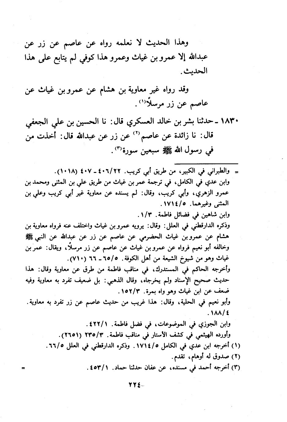 1830 - حَدَّثَنَا بِشْرُ بْنُ خَالِدٍ الْعَسْكَرِيُّ، قَالَ: نَا الْحُسَيْنُ بْنُ عَلِيٍّ الْجُعْفِيُّ، قَالَ: نا زَائِدَةُ، عَنْ عَاصِمٍ، عَنْ زِرٍّ، عَنْ عَبْدِ اللَّهِ قَالَ: «§أَخَذْتُ مِنْ فِي رَسُولِ اللَّهِ صَلَّى اللهُ عَلَيْهِ وَسَلَّمَ سَبْعِينَ سُورَةً»
