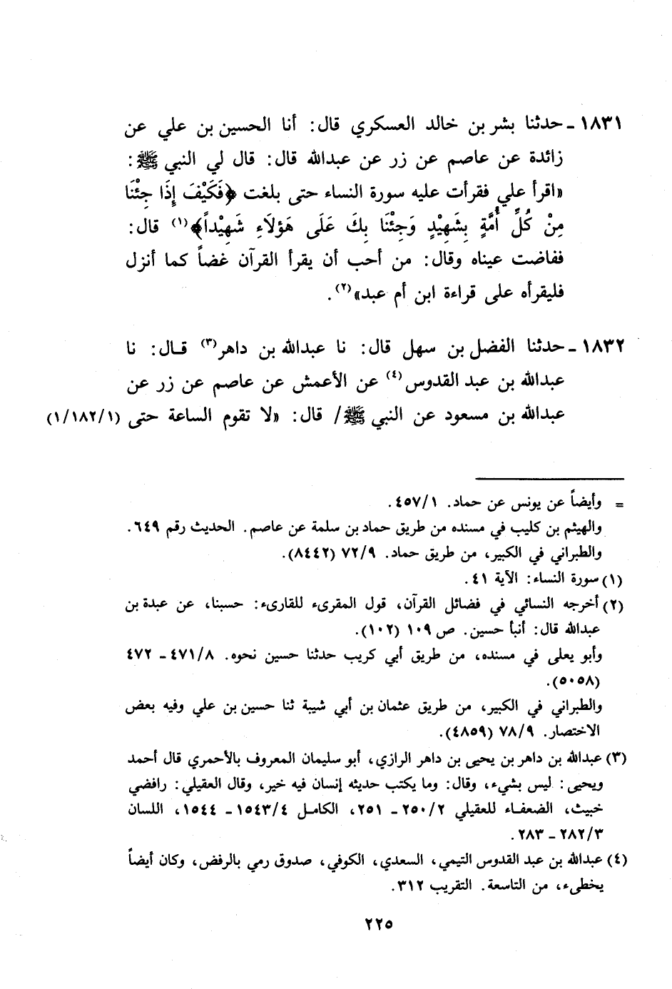 1831 - حَدَّثَنَا بِشْرُ بْنُ خَالِدٍ الْعَسْكَرِيُّ، قَالَ: أنَا الْحُسَيْنُ بْنُ عَلِيٍّ، عَنْ زَائِدَةَ، عَنْ عَاصِمٍ، عَنْ زِرٍّ، عَنْ عَبْدِ اللَّهِ قَالَ: قَالَ لِي النَّبِيُّ صَلَّى اللهُ عَلَيْهِ وَسَلَّمَ: «اقْرَأْ عَلَيَّ» ، فَقَرَأْتُ عَلَيْهِ سُورَةَ النِّسَاءِ، حَتَّى بَلَغْتُ {فَكَيْفَ إِذَا جِئْنَا مِنْ كُلِّ أُمَّةٍ بِشَهِيدٍ وَجِئْنَا بِكَ عَلَى هَؤُلَاءِ شَهِيدًا} [النساء: 41] ، قَالَ: فَفَاضَتْ عَيْنَاهُ وَقَالَ: «§مَنْ أَحَبَّ أَنْ يَقْرَأَ الْقُرْآنَ غَضًّا كَمَا أُنْزِلَ فَلْيَقْرَأْهُ عَلَى قِرَاءَةِ ابْنِ أُمِّ عَبْدٍ»