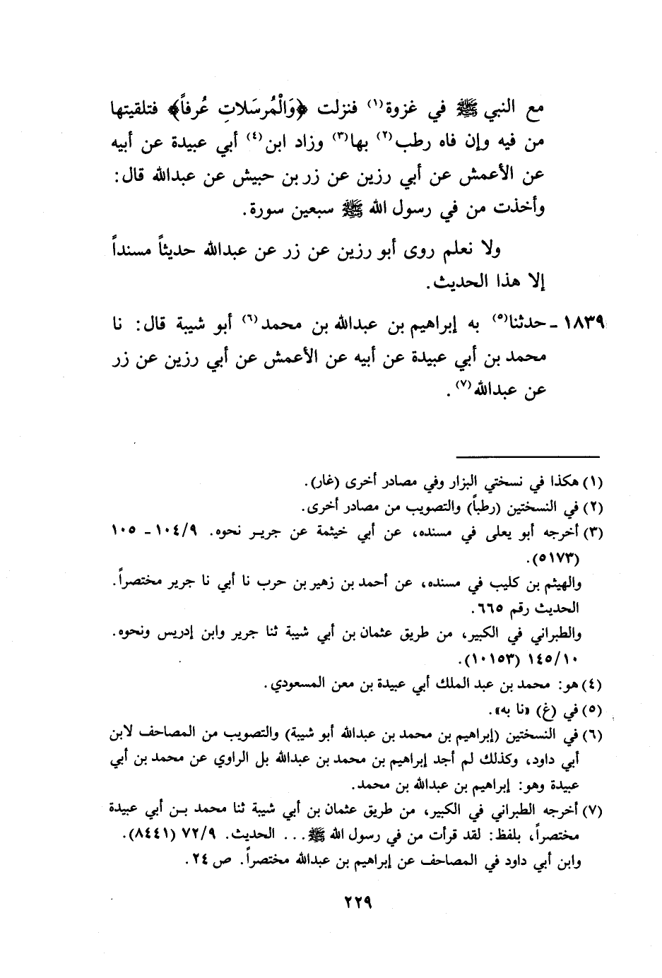 1839 - حَدَّثَنَا بِهِ إِبْرَاهِيمُ بْنُ عَبْدِ اللَّهِ بْنِ مُحَمَّدٍ أَبُو شَيْبَةَ، قَالَ: نا مُحَمَّدُ بْنُ أَبِي عُبَيْدَةَ، عَنْ أَبِيهِ، عَنِ الْأَعْمَشِ، عَنْ أَبِي رَزِينٍ، عَنْ زِرٍّ، عَنْ عَبْدِ اللَّهِ -[230]-،