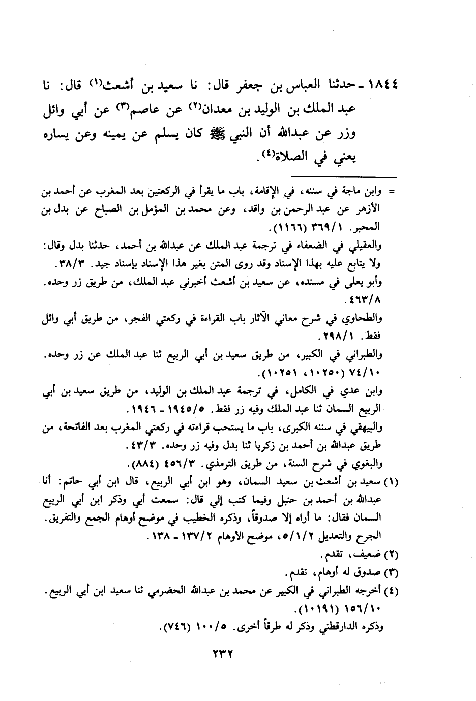 1844 - حَدَّثَنَا الْعَبَّاسُ بْنُ جَعْفَرٍ، قَالَ: نا سَعِيدُ بْنُ أَشْعَثَ، قَالَ: نا عَبْدُ الْمَلِكِ بْنُ الْوَلِيدِ بْنِ مَعْدَانَ، عَنْ عَاصِمٍ، عَنْ أَبِي وَائِلٍ، وَزِرٍّ، عَنْ عَبْدِ اللَّهِ، «أَنَّ النَّبِيَّ صَلَّى اللهُ عَلَيْهِ وَسَلَّمَ كَانَ §يُسَلِّمُ عَنْ يَمِينِهِ وَعَنْ يَسَارِهِ» ، يَعْنِي فِي الصَّلَاةِ -[233]-، وَهَذِهِ الْأَحَادِيثُ لَا نَعْلَمُ رَوَاهَا، عَنْ عَاصِمٍ، عَنْ أَبِي وَائِلٍ، وَزِرٍّ فَجَمَعَهُمَا إِلَّا عَبْدُ الْمَلِكِ بْنُ الْوَلِيدِ