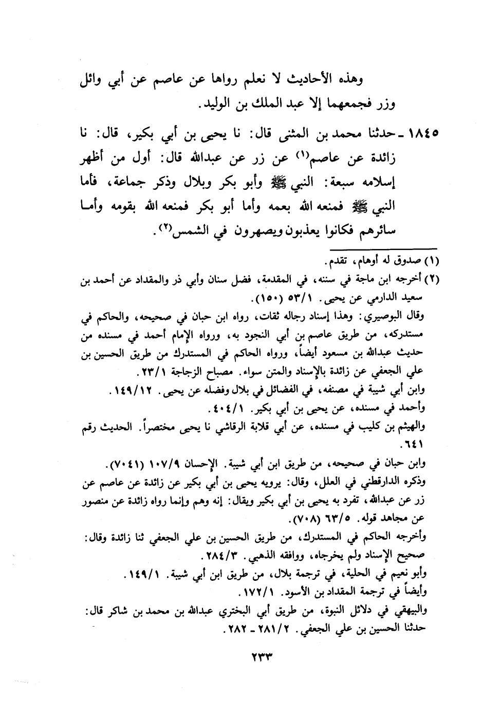 1845 - حَدَّثَنَا مُحَمَّدُ بْنُ الْمُثَنَّى، قَالَ: نا يَحْيَى بْنُ أَبِي بُكَيْرٍ، قَالَ: نا زَائِدَةُ، عَنْ عَاصِمٍ، عَنْ زِرٍّ، عَنْ عَبْدِ اللَّهِ، قَالَ: " §أَوَّلُ مَنْ أَظْهَرَ إِسْلَامَهُ سَبْعَةٌ: النَّبِيُّ صَلَّى اللهُ عَلَيْهِ وَسَلَّمَ، وَأَبُو بَكْرٍ، وَبِلَالٌ، وَذَكَرَ جَمَاعَةً، فَأَمَّا النَّبِيُّ صَلَّى اللهُ عَلَيْهِ وَسَلَّمَ فَمَنَعَهُ اللَّهُ بِعَمِّهِ، وَأَمَّا أَبُو بَكْرٍ فَمَنَعَهُ اللَّهُ بِقَوْمِهِ، وَأَمَّا سَائِرُهُمْ فَكَانُوا يُعَذَّبُونَ وَيُصْهَرُونَ فِي الشَّمْسِ " -[234]- وَهَذَا الْحَدِيثُ لَا نَعْلَمُ رَوَاهُ عَنْ زَائِدَةَ مَوْصُولًا إِلَّا يَحْيَى بْنُ أَبِي بُكَيْرٍ