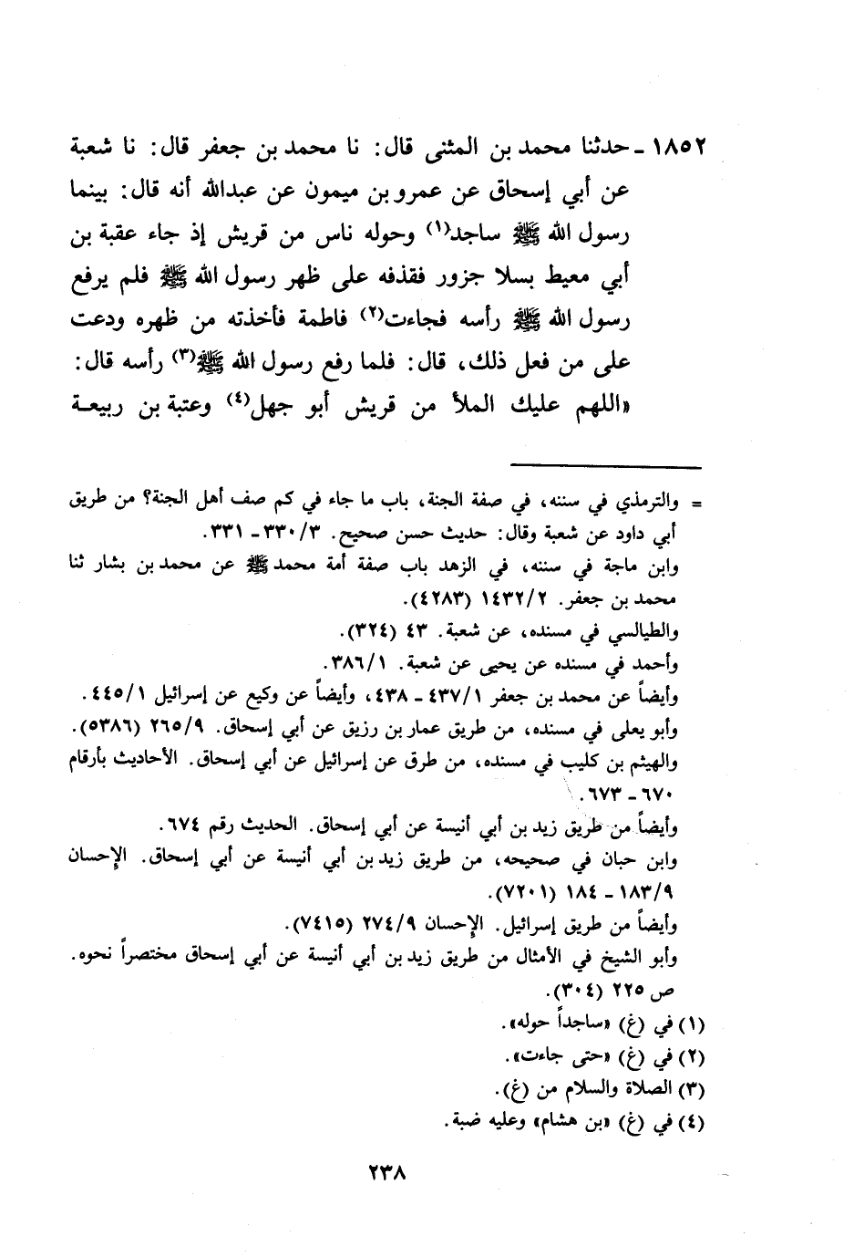 1852 - حَدَّثَنَا مُحَمَّدُ بْنُ الْمُثَنَّى، قَالَ: نا مُحَمَّدُ بْنُ جَعْفَرٍ، قَالَ: نا شُعْبَةُ، عَنْ أَبِي إِسْحَاقَ، عَنْ عَمْرِو بْنِ مَيْمُونٍ، عَنْ عَبْدِ اللَّهِ أَنَّهُ قَالَ: بَيْنَمَا رَسُولُ اللَّهِ صَلَّى اللهُ عَلَيْهِ وَسَلَّمَ سَاجِدٌ وَحَوْلَهُ نَاسٌ مِنْ قُرَيْشٍ إِذْ جَاءَ عُقْبَةُ بْنُ أَبِي مُعَيْطٍ بِسَلَا جَزُورٍ فَقَذَفَهُ عَلَى ظَهْرِ رَسُولِ اللَّهِ صَلَّى اللهُ عَلَيْهِ وَسَلَّمَ، فَلَمْ يَرْفَعْ رَسُولُ اللَّهِ صَلَّى اللهُ عَلَيْهِ وَسَلَّمَ رَأْسَهُ، فَجَاءَتْ فَاطِمَةُ فَأَخَذْتُهُ مِنْ ظَهْرِهِ وَدَعَتْ عَلَى مَنْ فَعَلَ ذَلِكَ، قَالَ: فَلَمَّا رَفَعَ رَسُولُ اللَّهِ صَلَّى اللهُ عَلَيْهِ وَسَلَّمَ رَأْسَهُ قَالَ: «§اللَّهُمَّ عَلَيْكَ الْمَلَأَ مِنْ قُرَيْشٍ أَبُو جَهْلٍ، وَعُتْبَةَ بْنَ رَبِيعَةَ -[239]-، وَشَيْبَةَ بْنَ رَبِيعَةَ، وَعُقْبَةَ بْنَ أَبِي مُعَيْطٍ، وَأُمَيَّةَ بْنَ خَلَفٍ، أَوِ ابْنَ أَبِي خَلَفٍ ـ شُعْبَةَ الشَّاكُّ» ، قَالَ: فَلَقَدْ رَأَيْتُهُمْ قُتِلُوا يَوْمَ بَدْرٍ فَأُلْقُوا فِي الْقَلِيبِ إِلَّا أُمَيَّةَ أَوْ أَبِي تَقَطَّعَتْ أَوْصَالُهُ فَلَمْ يُلْقَ فِي الْبِئْرِ