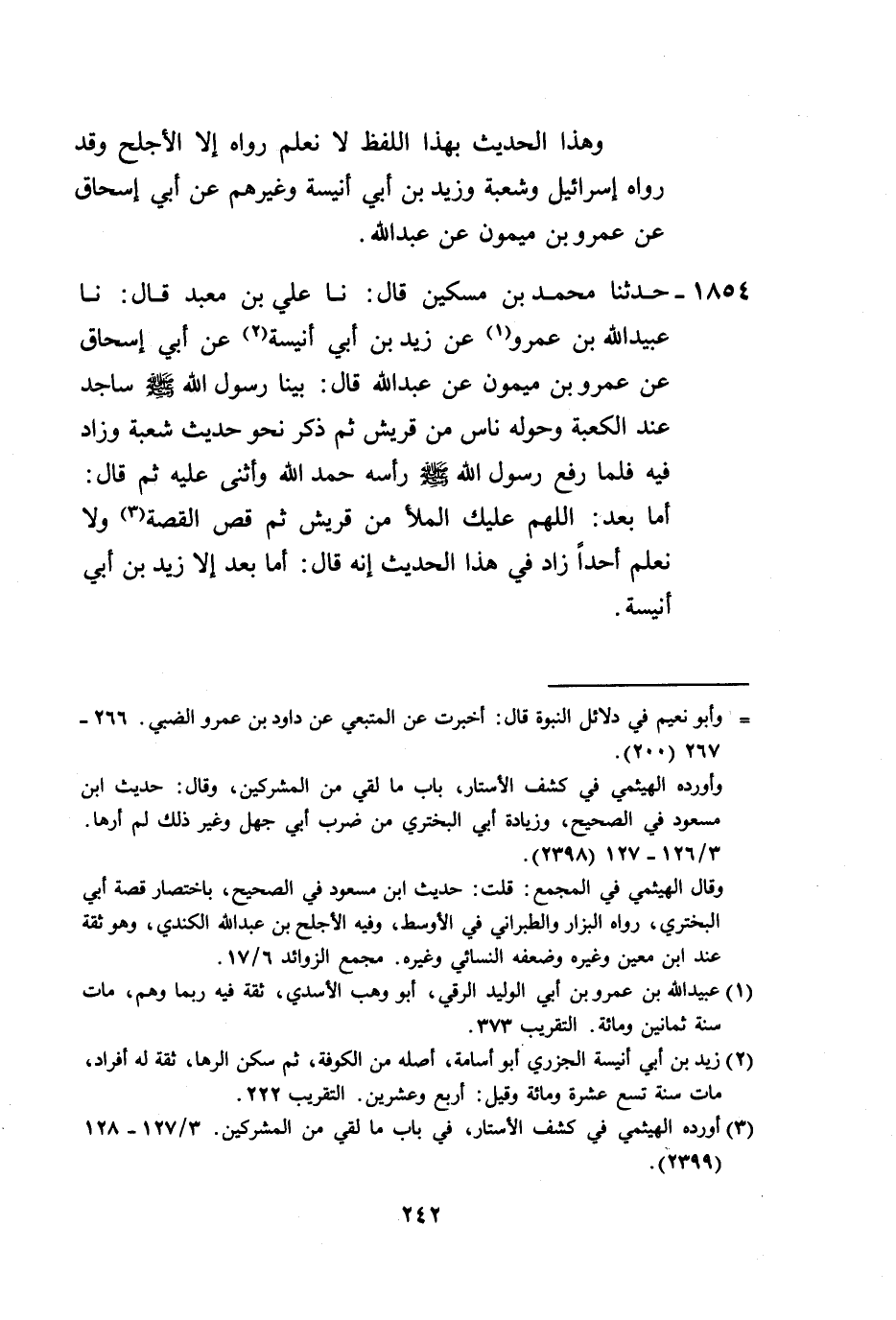 1854 - حَدَّثَنَا مُحَمَّدُ بْنُ مِسْكِينٍ، قَالَ: نا عَلِيُّ بْنُ مَعْبَدٍ، قَالَ: نا عُبَيْدُ اللَّهِ بْنُ عَمْرٍو، عَنْ زَيْدِ بْنِ أَبِي أُنَيْسَةَ، عَنْ أَبِي إِسْحَاقَ، عَنْ عَمْرِو بْنِ مَيْمُونٍ، عَنْ عَبْدِ اللَّهِ قَالَ: بَيْنَا رَسُولُ اللَّهِ صَلَّى اللهُ عَلَيْهِ وَسَلَّمَ §سَاجِدٌ عِنْدَ الْكَعْبَةِ وَحَوْلَهُ نَاسٌ مِنْ قُرَيْشٍ، ثُمَّ ذَكَرَ نَحْوَ حَدِيثِ شُعْبَةَ وَزَادَ فِيهِ، فَلَمَّا رَفَعَ رَسُولُ اللَّهِ صَلَّى اللهُ عَلَيْهِ وَسَلَّمَ رَأْسَهُ حَمِدَ اللَّهَ وَأَثْنَى عَلَيْهِ ثُمَّ قَالَ: «أَمَّا بَعْدُ، اللَّهُمَّ عَلَيْكَ الْمَلَأَ مِنْ قُرَيْشٍ» ، ثُمَّ قَصَّ الْقِصَّةَ وَلَا نَعْلَمُ أَحَدًا زَادَ فِي هَذَا الْحَدِيثِ أَنَّهُ قَالَ: «أَمَّا بَعْدُ إِلَّا زَيْدَ بْنَ أَبِي أُنَيْسَةَ»