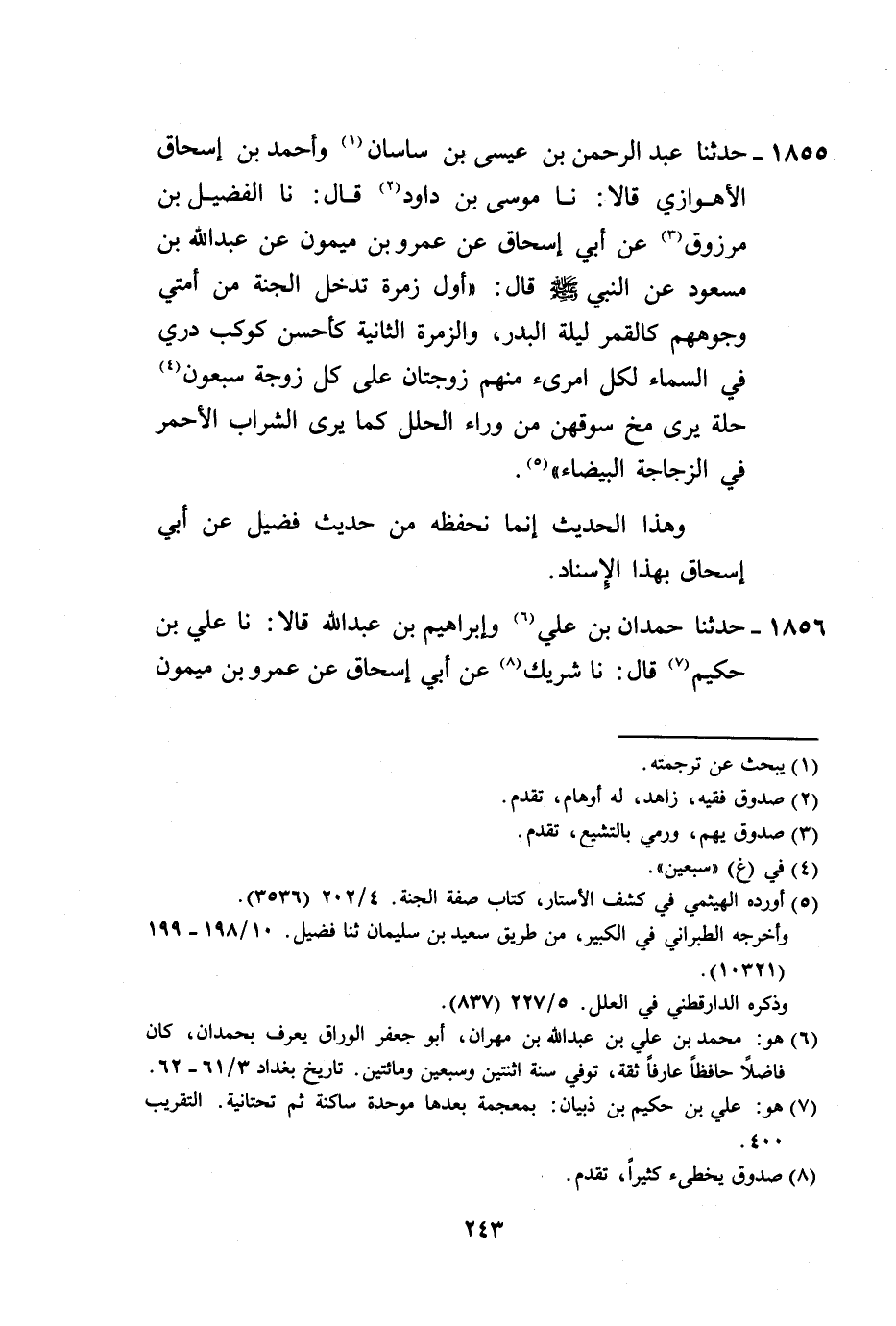 1855 - حَدَّثَنَا عَبْدُ الرَّحْمَنِ بْنُ عِيسَى بْنِ سَاسَانَ، وَأَحْمَدُ بْنُ إِسْحَاقَ الْأَهْوَازِيُّ، قَالَا: نا مُوسَى بْنُ دَاوُدَ، قَالَ: نَا الْفُضَيْلُ بْنُ مَرْزُوقٍ، عَنْ أَبِي إِسْحَاقَ، عَنْ عَمْرِو بْنِ مَيْمُونٍ، عَنْ عَبْدِ اللَّهِ بْنِ مَسْعُودٍ، عَنِ النَّبِيِّ صَلَّى اللهُ عَلَيْهِ وَسَلَّمَ قَالَ: «§أَوَّلُ زُمْرَةٍ تَدْخُلُ الْجَنَّةَ مِنْ أُمَّتِي وُجُوهُهُمْ كَالْقَمَرِ لَيْلَةَ الْبَدْرِ، وَالزُّمْرَةُ الثَّانِيَةُ كَأَحْسَنِ كَوْكَبٍ دُرِّيٍّ فِي السَّمَاءِ، لِكُلِّ امْرِئٍ مِنْهُمْ زَوْجَتَانِ، عَلَى كُلِّ زَوْجَةٍ سَبْعُونَ حُلَّةً يُرَى مُخَّ سُوقِهِنَّ مِنْ وَرَاءِ الْحُلَلِ كَمَا يُرَى الشَّرَابُ الْأَحْمَرُ فِي الزُّجَاجَةِ الْبَيْضَاءِ» ، وَهَذَا الْحَدِيثُ إِنَّمَا نَحْفَظُهُ مِنْ حَدِيثِ فُضَيْلٍ، عَنْ أَبِي إِسْحَاقَ بِهَذَا الْإِسْنَادِ