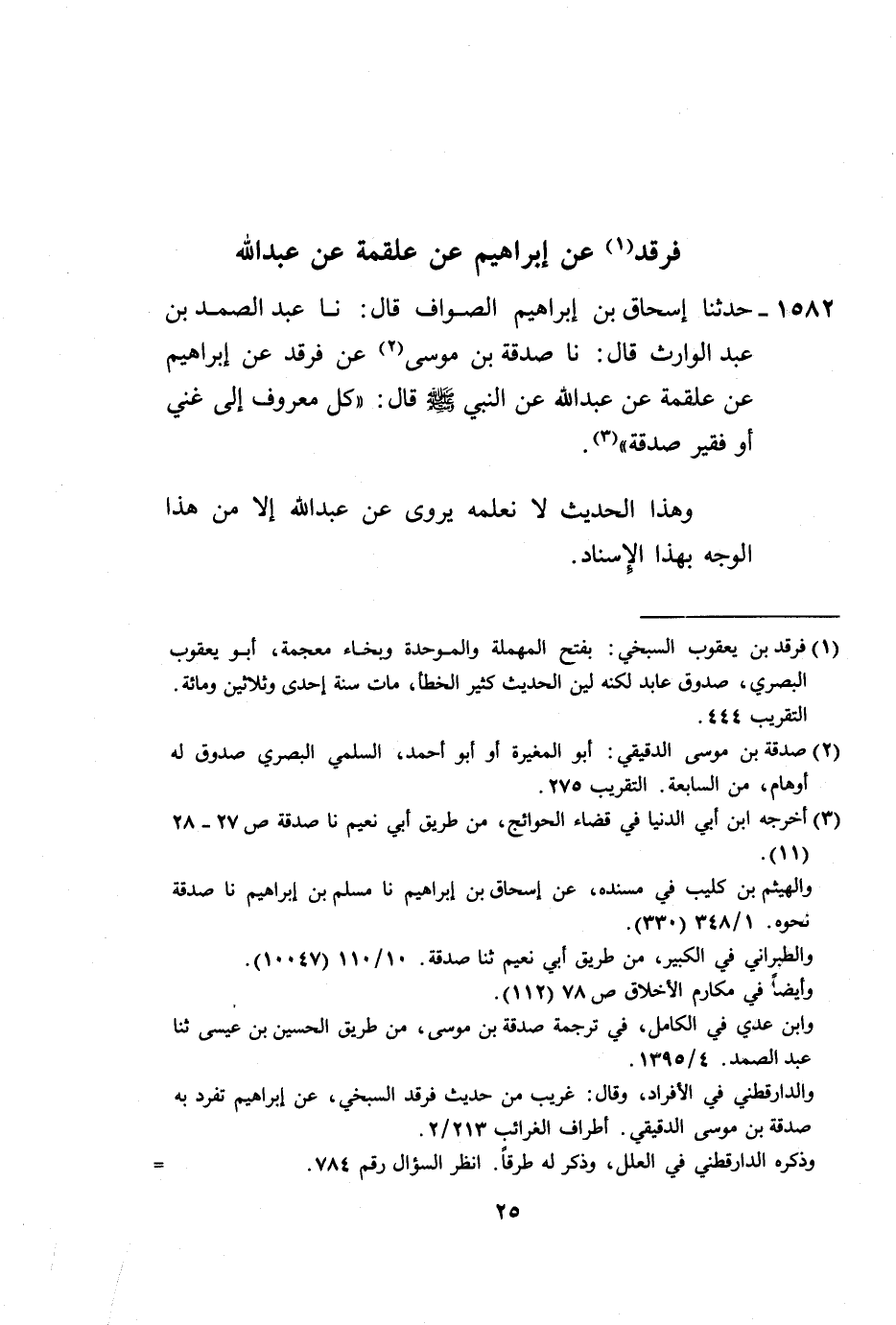 1582 - حَدَّثَنَا إِسْحَاقُ بْنُ إِبْرَاهِيمَ الصَّوَّافُ، قَالَ: نا عَبْدُ الصَّمَدِ بْنُ عَبْدِ الْوَارِثِ، قَالَ: نا صَدَقَةُ بْنُ مُوسَى، عَنْ فَرْقَدٍ، عَنْ إِبْرَاهِيمَ، عَنْ عَلْقَمَةَ، عَنْ عَبْدِ اللَّهِ، عَنِ النَّبِيِّ صَلَّى اللهُ عَلَيْهِ وَسَلَّمَ قَالَ: «§كُلُّ مَعْرُوفٍ إِلَى غَنِيٍّ أَوْ فَقِيرٍ صَدَقَةٌ» وَهَذَا الْحَدِيثُ لَا نَعْلَمُهُ يُرْوَى عَنْ عَبْدِ اللَّهِ إِلَّا مِنْ هَذَا الْوَجْهِ بِهَذَا الْإِسْنَادِ