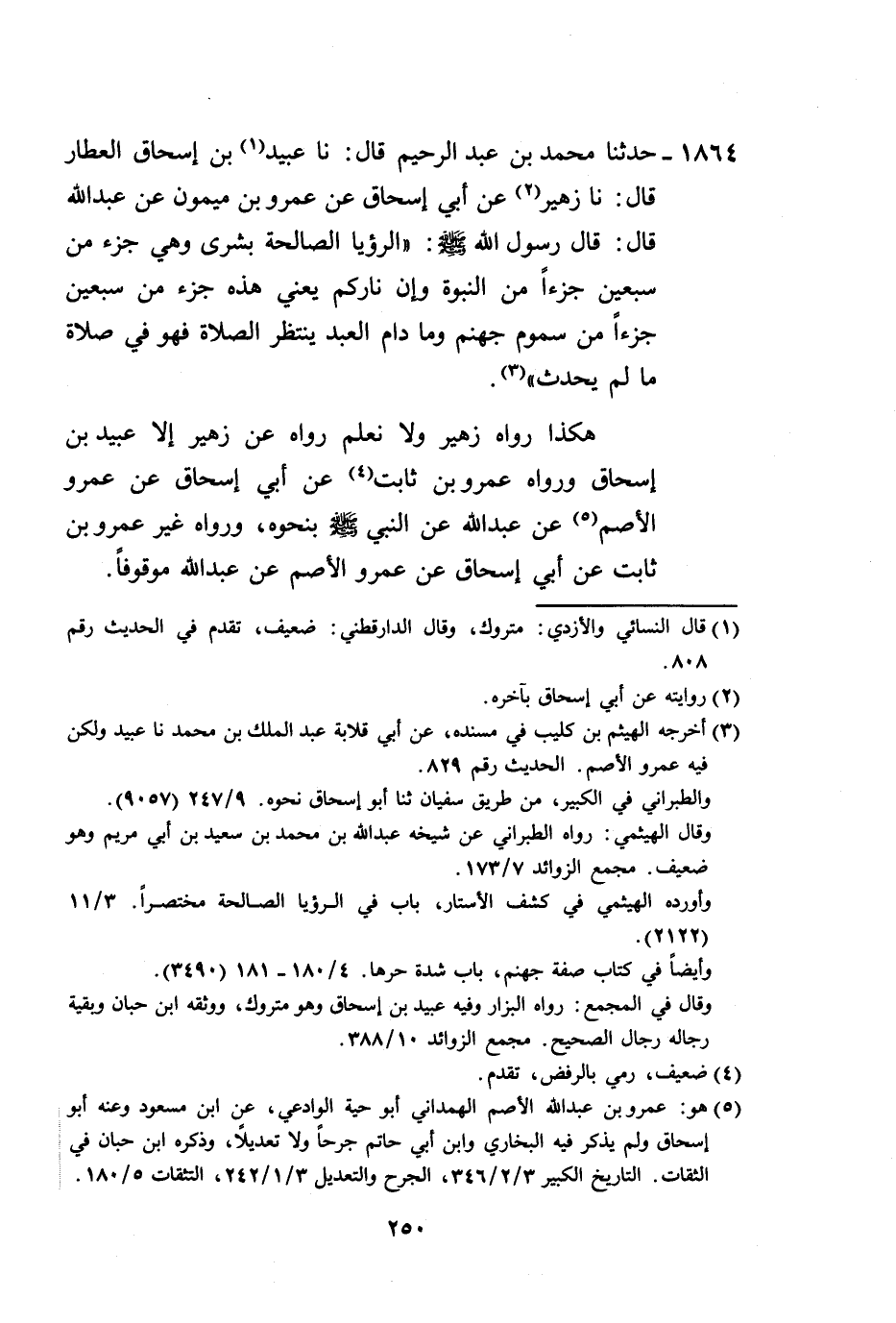 1864 - حَدَّثَنَا مُحَمَّدُ بْنُ عَبْدِ الرَّحِيمِ، قَالَ: نا عُبَيْدُ بْنُ إِسْحَاقَ الْعَطَّارُ، قَالَ: نا زُهَيْرٌ، عَنْ أَبِي إِسْحَاقَ، عَنْ عَمْرِو بْنِ مَيْمُونٍ، عَنْ عَبْدِ اللَّهِ قَالَ: قَالَ رَسُولُ اللَّهِ صَلَّى اللهُ عَلَيْهِ وَسَلَّمَ: «§الرُّؤْيَا الصَّالِحَةُ بُشْرَى وَهِيَ جُزْءٌ مِنْ سَبْعِينَ جُزْءًا مِنَ النُّبُوَّةِ، وَإِنَّ نَارَكُمْ يَعْنِي هَذِهِ جُزْءٌ مِنْ سَبْعِينَ جُزْءًا مِنْ سَمُومِ جَهَنَّمَ، وَمَا دَامَ الْعَبْدُ يَنْتَظِرُ الصَّلَاةَ فَهُوَ فِي صَلَاةٍ مَا لَمْ يُحْدِثْ» ، هَكَذَا رَوَاهُ زُهَيْرٌ وَلَا نَعْلَمُ رَوَاهُ عَنْ زُهَيْرٍ إِلَّا عُبَيْدُ بْنُ إِسْحَاقَ، وَرَوَاهُ عَمْرُو بْنُ ثَابِتٍ، عَنْ أَبِي إِسْحَاقَ، عَنْ عَمْرٍو الْأَصَمِّ، عَنْ عَبْدِ اللَّهِ، عَنِ النَّبِيِّ صَلَّى اللهُ عَلَيْهِ وَسَلَّمَ، بِنَحْوِهِ، وَرَوَاهُ غَيْرُ عَمْرِو بْنِ ثَابِتٍ، عَنْ أَبِي إِسْحَاقَ، عَنْ عَمْرٍو الْأَصَمِّ، عَنْ عَبْدِ اللَّهِ مَوْقُوفًا