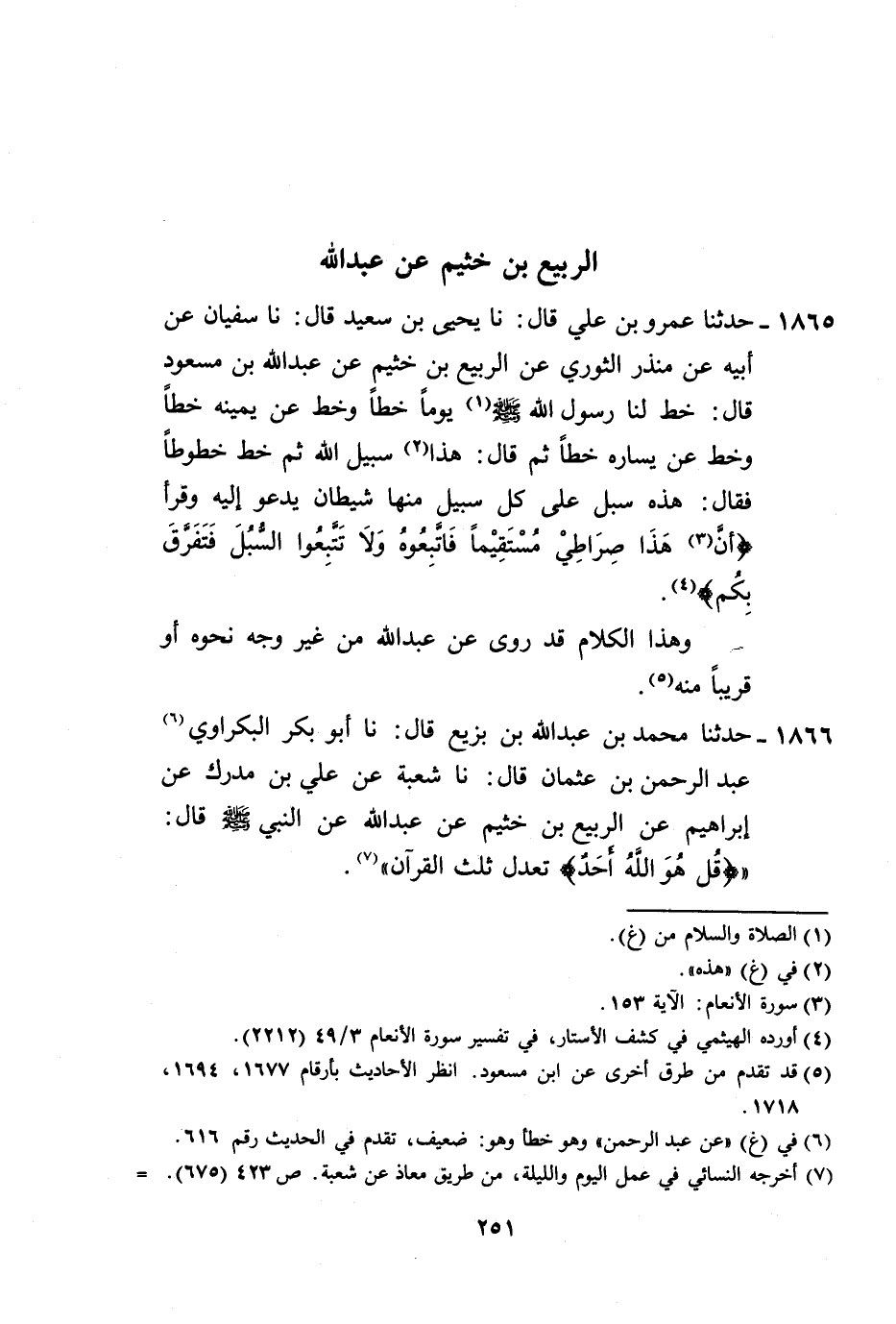 1865 - حَدَّثَنَا عَمْرُو بْنُ عَلِيٍّ، قَالَ: نا يَحْيَى بْنُ سَعِيدٍ، قَالَ: نا سُفْيَانُ، عَنْ أَبِيهِ، عَنْ مُنْذِرٍ الثَّوْرِيِّ، عَنِ الرَّبِيعِ بْنِ خُثَيْمٍ، عَنْ عَبْدِ اللَّهِ بْنِ مَسْعُودٍ قَالَ: خَطَّ لَنَا رَسُولُ اللَّهِ صَلَّى اللهُ عَلَيْهِ وَسَلَّمَ يَوْمًا خَطًّا، وَخَطَّ عَنْ يَمِينِهِ خَطًّا، وَخَطَّ عَنْ يَسَارِهِ خَطًّا، ثُمَّ قَالَ: «§هَذَا سَبِيلُ اللَّهِ» ، ثُمَّ خَطَّ خُطُوطًا فَقَالَ: «هَذِهِ سُبُلٌ، عَلَى كُلِّ سَبِيلٍ مِنْهَا شَيْطَانٌ يَدْعُو إِلَيْهِ» ، وَقَرَأَ {أَنَّ هَذَا صِرَاطِي مُسْتَقِيمًا فَاتَّبِعُوهُ وَلَا تَتَّبِعُوا السُّبُلَ} [الأنعام: 153] فَتَفَرَّقَ بِكُمْ، وَهَذَا الْكَلَامُ قَدْ رُوِيَ، عَنْ عَبْدِ اللَّهِ مِنْ غَيْرِ وَجْهٍ نَحْوَهُ أَوْ قَرِيبًا مِنْهُ