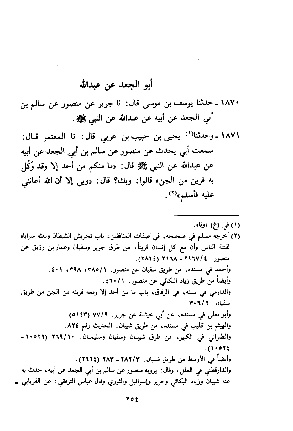 1871 - وَحَدَّثَنَا يَحْيَى بْنُ حَبِيبِ بْنِ عَرَبِيٍّ، قَالَ: نا الْمُعْتَمِرُ، قَالَ: سَمِعْتُ أَبِي يُحَدِّثُ، عَنْ مَنْصُورٍ، عَنْ سَالِمِ بْنِ أَبِي الْجَعْدِ، عَنْ أَبِيهِ، عَنْ عَبْدِ اللَّهِ، عَنِ النَّبِيِّ صَلَّى اللهُ عَلَيْهِ وَسَلَّمَ قَالَ: «§مَا مِنْكُمْ مِنْ أَحَدٍ إِلَّا وَقَدْ وُكِّلَ بِهِ قَرِينٌ مِنَ الْجِنِّ» ، قَالُوا: وَبِكَ؟ قَالَ: «وَبِي، إِلَّا أَنَّ اللَّهَ أَعَانَنِي عَلَيْهِ فَأَسْلَمَ» -[255]-، وَهَذَا الْحَدِيثُ بِهَذَا اللَّفْظِ لَا نَحْفَظُهُ عَنْ عَبْدِ اللَّهِ إِلَّا بِهَذَا الْإِسْنَادِ