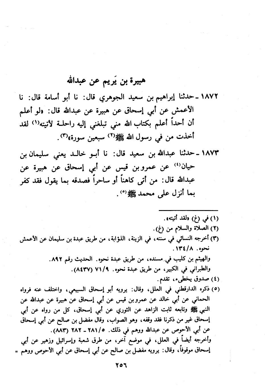 1873 - حَدَّثَنَا عَبْدُ اللَّهِ بْنُ سَعِيدٍ، قَالَ: نا أَبُو خَالِدٍ يَعْنِي سُلَيْمَانَ بْنَ حَيَّانَ، عَنْ عَمْرِو بْنِ قَيْسٍ، عَنْ أَبِي إِسْحَاقَ، عَنْ هُبَيْرَةَ، عَنْ عَبْدِ اللَّهِ قَالَ: «§مَنْ أَتَى كَاهِنًا أَوْ سَاحِرًا فَصَدَّقَهُ بِمَا يَقُولُ فَقَدْ كَفَرَ بِمَا أُنْزِلَ عَلَى مُحَمَّدٍ صَلَّى اللهُ عَلَيْهِ وَسَلَّمَ» -[257]-، وَهَذَا الْحَدِيثُ قَدْ رَوَاهُ غَيْرُ وَاحِدٍ، عَنْ أَبِي إِسْحَاقَ، عَنْ هُبَيْرَةَ، عَنْ عَبْدِ اللَّهِ، وَأَمَّا حَدِيثُ أَخَذْتُ مِنْ فِيِّ رَسُولِ اللَّهِ اللَّهِ صَلَّى اللهُ عَلَيْهِ وَسَلَّمَ سَبْعِينَ سُورَةً فَلَا نَعْلَمُ رَوَاهُ عَنْ أَبِي إِسْحَاقَ، عَنْ هُبَيْرَةَ إِلَّا الْأَعْمَشُ، وَلَا رَوَاهُ عَنِ الْأَعْمَشِ إِلَّا أَبُو أُسَامَةَ، وَعَبْدَةُ بْنُ سُلَيْمَانَ