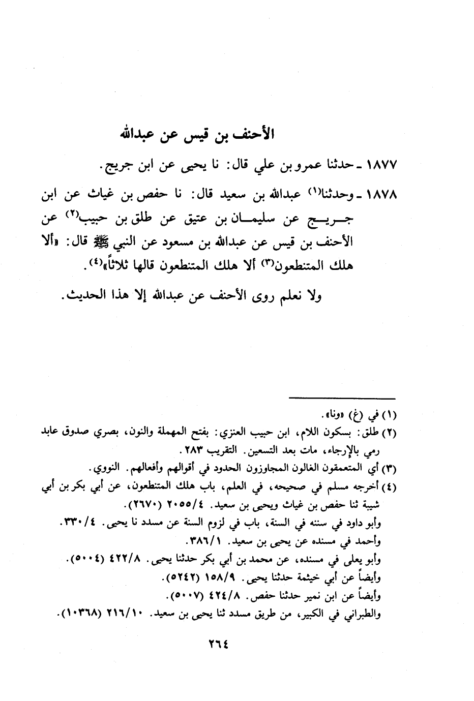 1878 - وَحَدَّثَنَا عَبْدُ اللَّهِ بْنُ سَعِيدٍ، قَالَ: نا حَفْصُ بْنُ غِيَاثٍ، عَنِ ابْنِ جُرَيْجٍ، عَنْ سُلَيْمَانَ بْنِ عَتِيقٍ، عَنْ طَلْقِ بْنِ حَبِيبٍ، عَنِ الْأَحْنَفِ بْنِ قَيْسٍ، عَنْ عَبْدِ اللَّهِ بْنِ مَسْعُودٍ، عَنِ النَّبِيِّ صَلَّى اللهُ عَلَيْهِ وَسَلَّمَ قَالَ: «§أَلَا هَلَكَ الْمُتَنَطِّعُونَ، أَلَا هَلَكَ الْمُتَنَطِّعُونَ» قَالَهَا ثَلَاثًا وَلَا نَعْلَمُ رَوَى الْأَحْنَفُ، عَنْ عَبْدِ اللَّهِ إِلَّا هَذَا الْحَدِيثَ