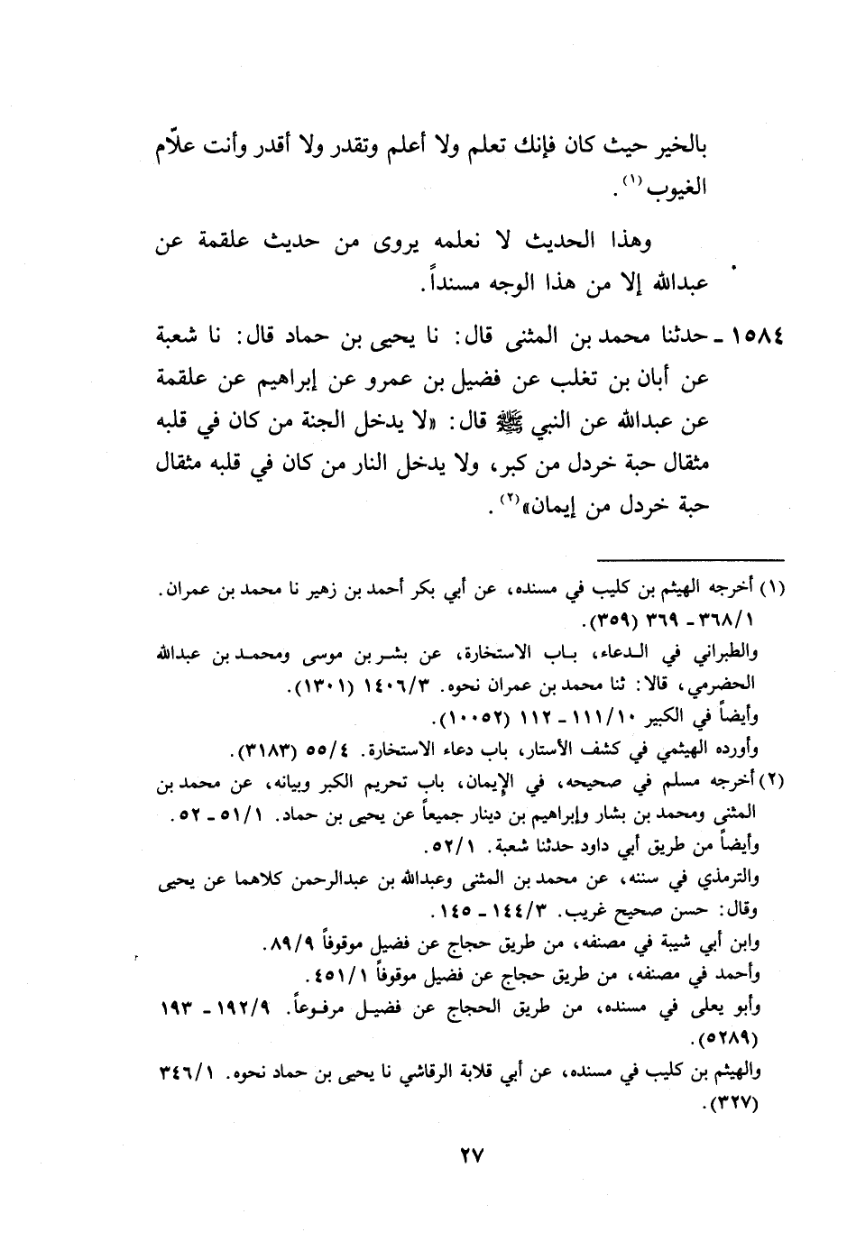 1584 - حَدَّثَنَا مُحَمَّدُ بْنُ الْمُثَنَّى، قَالَ: نا يَحْيَى بْنُ حَمَّادٍ، قَالَ: نا شُعْبَةُ، عَنْ أَبَانَ بْنِ تَغْلِبَ، عَنْ فُضَيْلِ بْنِ عَمْرٍو، عَنْ إِبْرَاهِيمَ، عَنْ عَلْقَمَةَ، عَنْ عَبْدِ اللَّهِ، عَنِ النَّبِيِّ صَلَّى اللهُ عَلَيْهِ وَسَلَّمَ قَالَ: «§لَا يَدْخُلُ الْجَنَّةَ مَنْ كَانَ فِي قَلْبِهِ مِثْقَالُ حَبَّةِ خَرْدَلٍ مِنْ كِبْرٍ، وَلَا يَدْخُلُ النَّارَ مَنْ كَانَ فِي قَلْبِهِ مِثْقَالُ حَبَّةِ خَرْدَلٍ مِنْ إِيمَانٍ» -[28]-، وَهَذَا الْحَدِيثُ لَا نَعْلَمُ رَوَاهُ عَنْ فُضَيْلٍ إِلَّا أَبَانُ بْنُ تَغْلِبَ، وَلَا عَنْ أَبَانَ، إِلَّا شُعْبَةُ