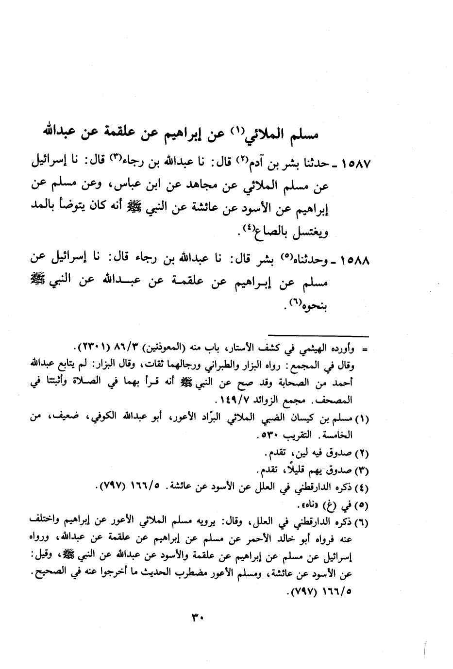 1587 - حَدَّثَنَا بِشْرُ بْنُ آدَمَ، قَالَ: نا عَبْدُ اللَّهِ بْنُ رَجَاءٍ، قَالَ: نا إِسْرَائِيلُ، عَنْ مُسْلِمٍ الْمُلَائِيِّ، عَنْ مُجَاهِدٍ، عَنِ ابْنِ عَبَّاسٍ، وَعَنْ مُسْلِمٍ، عَنْ إِبْرَاهِيمَ، عَنِ الْأَسْوَدِ، عَنْ عَائِشَةَ، عَنِ النَّبِيِّ صَلَّى اللهُ عَلَيْهِ وَسَلَّمَ، أَنَّهُ «كَانَ §يَتَوَضَّأُ بِالْمُدِّ وَيَغْتَسِلُ بِالصَّاعِ» ،