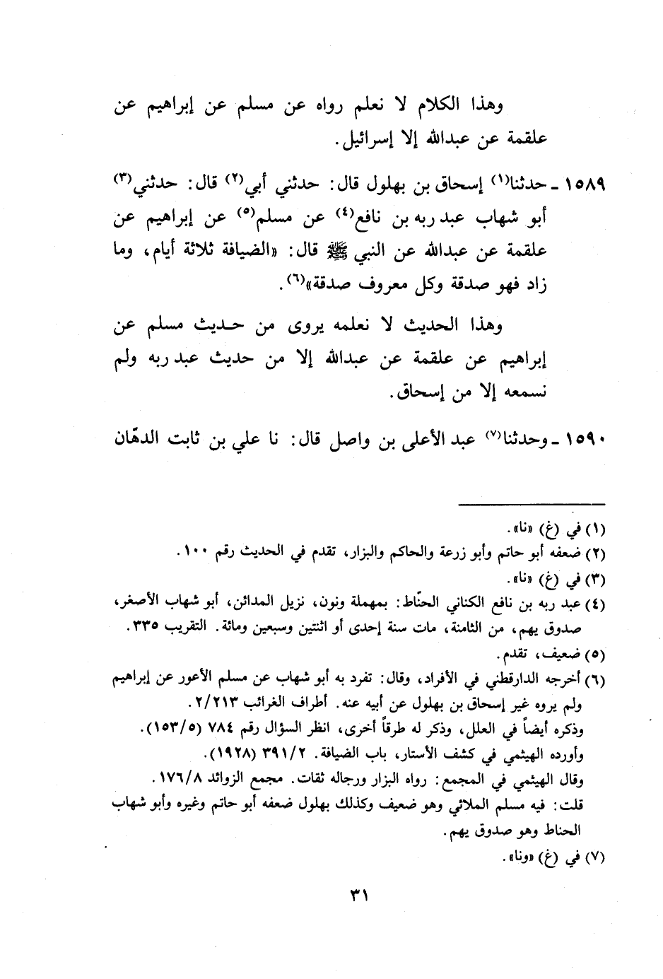 1589 - حَدَّثَنَا إِسْحَاقُ بْنُ بُهْلُولٍ، قَالَ: حَدَّثَنِي أَبِي، قَالَ: حَدَّثَنِي أَبُو شِهَابٍ عَبْدُ رَبِّهِ بْنُ نَافِعٍ، عَنْ مُسْلِمٍ، عَنْ إِبْرَاهِيمَ، عَنْ عَلْقَمَةَ، عَنْ عَبْدِ اللَّهِ، عَنِ النَّبِيِّ صَلَّى اللهُ عَلَيْهِ وَسَلَّمَ قَالَ: «§الضِّيَافَةُ ثَلَاثَةُ أَيَّامٍ، وَمَا زَادَ فَهُوَ صَدَقَةٌ، وَكُلُّ مَعْرُوفٍ صَدَقَةٌ» ، وَهَذَا الْحَدِيثُ لَا نَعْلَمُهُ يُرْوَى مِنْ حَدِيثِ مُسْلِمٍ، عَنْ إِبْرَاهِيمَ، عَنْ عَلْقَمَةَ، عَنْ عَبْدِ اللَّهِ، إِلَّا مِنْ حَدِيثِ عَبْدِ رَبِّهِ، وَلَمْ نَسْمَعْهُ إِلَّا مِنْ إِسْحَاقَ