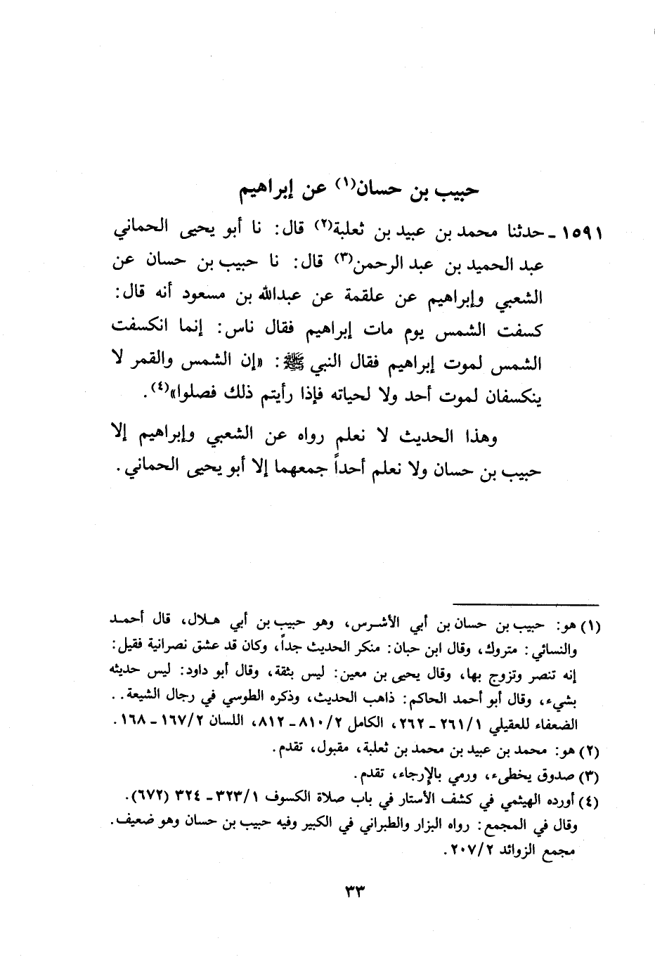 1591 - حَدَّثَنَا مُحَمَّدُ بْنُ عُبَيْدِ بْنِ ثَعْلَبَةَ، قَالَ: نا أَبُو يَحْيَى الْحِمَّانِيُّ عَبْدُ الْحَمِيدِ بْنُ عَبْدِ الرَّحْمَنِ، قَالَ: نا حَبِيبُ بْنُ حَسَّانَ، عَنِ الشَّعْبِيِّ، وَإِبْرَاهِيمَ، عَنْ عَلْقَمَةَ، عَنْ عَبْدِ اللَّهِ بْنِ مَسْعُودٍ أَنَّهُ قَالَ: كَسَفَتِ الشَّمْسُ يَوْمَ مَاتَ إِبْرَاهِيمُ فَقَالَ نَاسٌ: إِنَّمَا انْكَسَفَتِ الشَّمْسُ لِمَوْتِ إِبْرَاهِيمَ، فَقَالَ النَّبِيُّ صَلَّى اللهُ عَلَيْهِ وَسَلَّمَ: «إِنَّ §الشَّمْسَ وَالْقَمَرَ لَا يَنْكَسِفَانِ لِمَوْتِ أَحَدٍ وَلَا لِحَيَاتِهِ فَإِذَا رَأَيْتُمْ ذَلِكَ فَصَلُّوا» ، وَهَذَا الْحَدِيثُ لَا نَعْلَمُ رَوَاهُ عَنِ الشَّعْبِيِّ، وَإِبْرَاهِيمَ، إِلَّا حَبِيبُ بْنُ حَسَّانَ، وَلَا نَعْلَمُ أَحَدًا جَمَعَهُمَا إِلَّا أَبُو يَحْيَى الْحِمَّانِيُّ