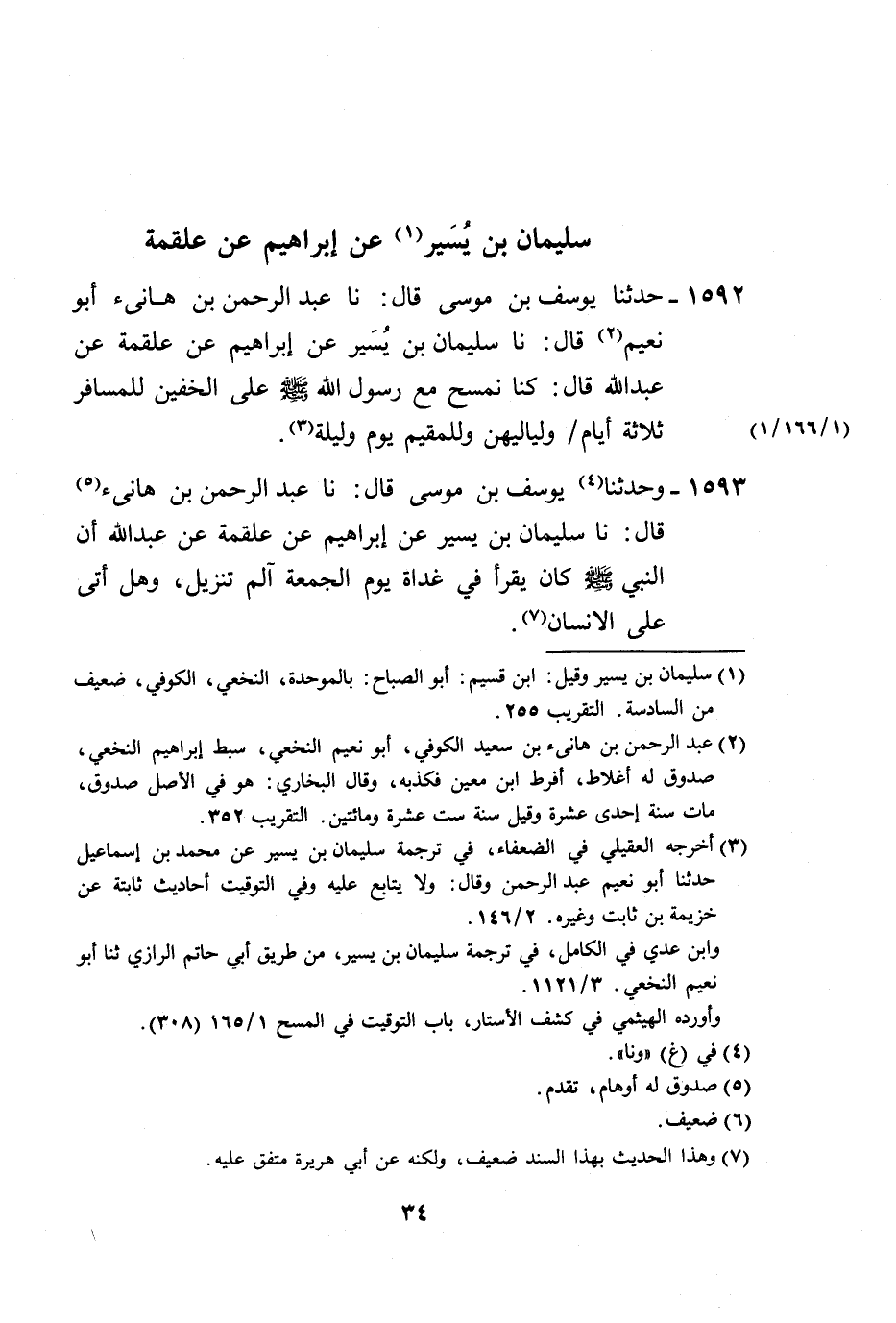 1592 - حَدَّثَنَا يُوسُفُ بْنُ مُوسَى، قَالَ: نا عَبْدُ الرَّحْمَنِ بْنُ هَانِئٍ أَبُو نُعَيْمٍ، قَالَ: نا سُلَيْمَانُ بْنُ يَسِيرٍ، عَنْ إِبْرَاهِيمَ، عَنْ عَلْقَمَةَ، عَنْ عَبْدِ اللَّهِ قَالَ: «كُنَا §نَمْسَحُ مَعَ رَسُولِ اللَّهِ صَلَّى اللهُ عَلَيْهِ وَسَلَّمَ عَلَى الْخُفَّيْنِ لِلْمُسَافِرِ ثَلَاثَةُ أَيَّامٍ وَلَيَالِيهِنَّ وَلِلْمُقِيمِ يَوْمٌ وَلَيْلَةٌ»