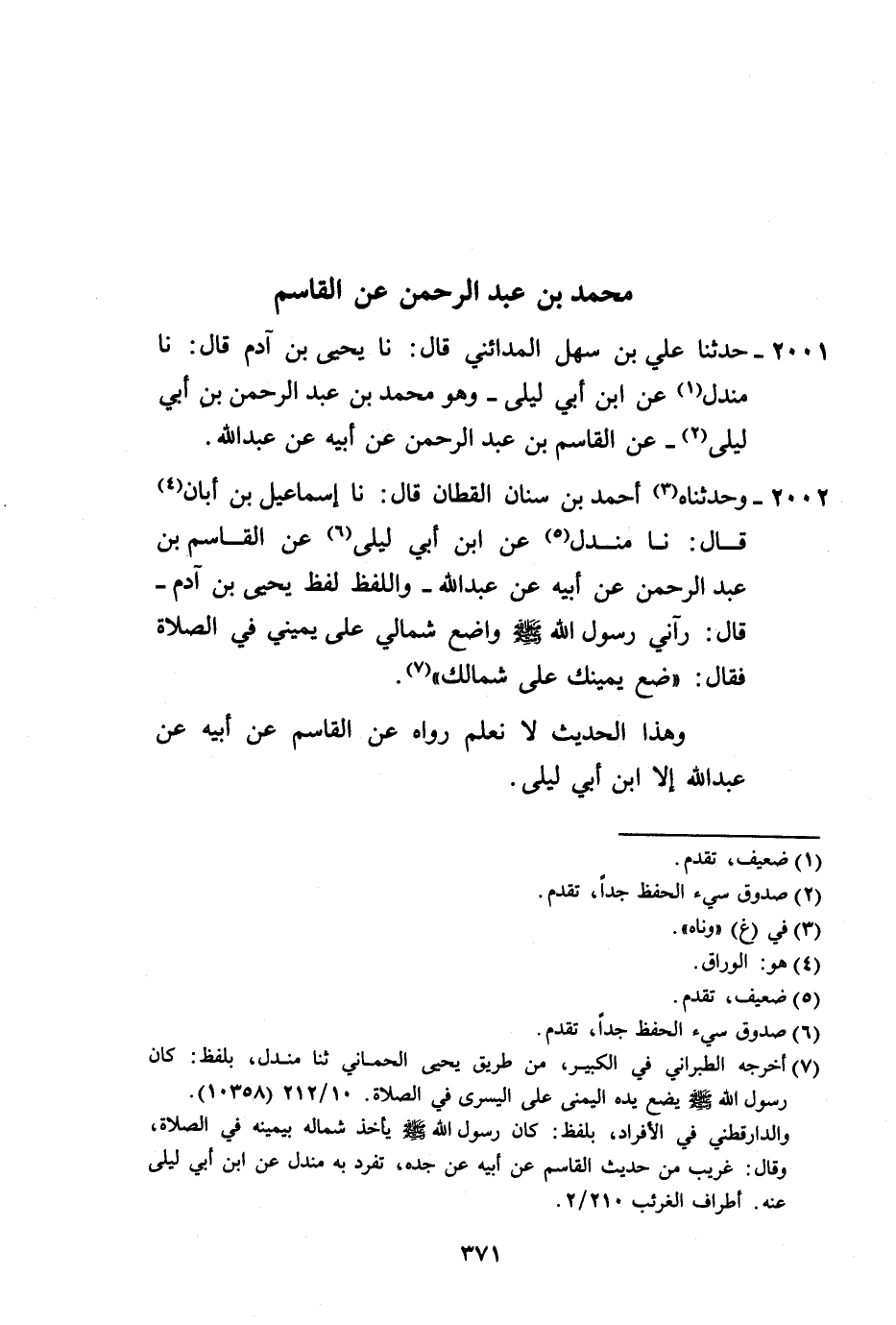 2002 - وَحَدَّثَنَاهُ أَحْمَدُ بْنُ سِنَانٍ الْقَطَّانُ، قَالَ: نا إِسْمَاعِيلُ بْنُ أَبَانَ، قَالَ: نا مِنْدَلٌ، عَنِ ابْنِ أَبِي لَيْلَى، عَنِ الْقَاسِمِ بْنِ عَبْدِ الرَّحْمَنِ، عَنْ أَبِيهِ، عَنْ عَبْدِ اللَّهِ ـ وَاللَّفْظُ لَفْظُ يَحْيَى بْنِ آدَمَ ـ قَالَ: رَآنِي رَسُولُ اللَّهِ صَلَّى اللهُ عَلَيْهِ وَسَلَّمَ وَاضِعَ شِمَالِي عَلَى يَمِينِي فِي الصَّلَاةِ، فَقَالَ: «§ضَعْ يَمِينَكَ عَلَى شِمَالِكَ» ، وَهَذَا الْحَدِيثُ لَا نَعْلَمُ رَوَاهُ عَنِ الْقَاسِمِ، عَنْ أَبِيهِ، عَنْ عَبْدِ اللَّهِ إِلَّا ابْنُ أَبِي لَيْلَى