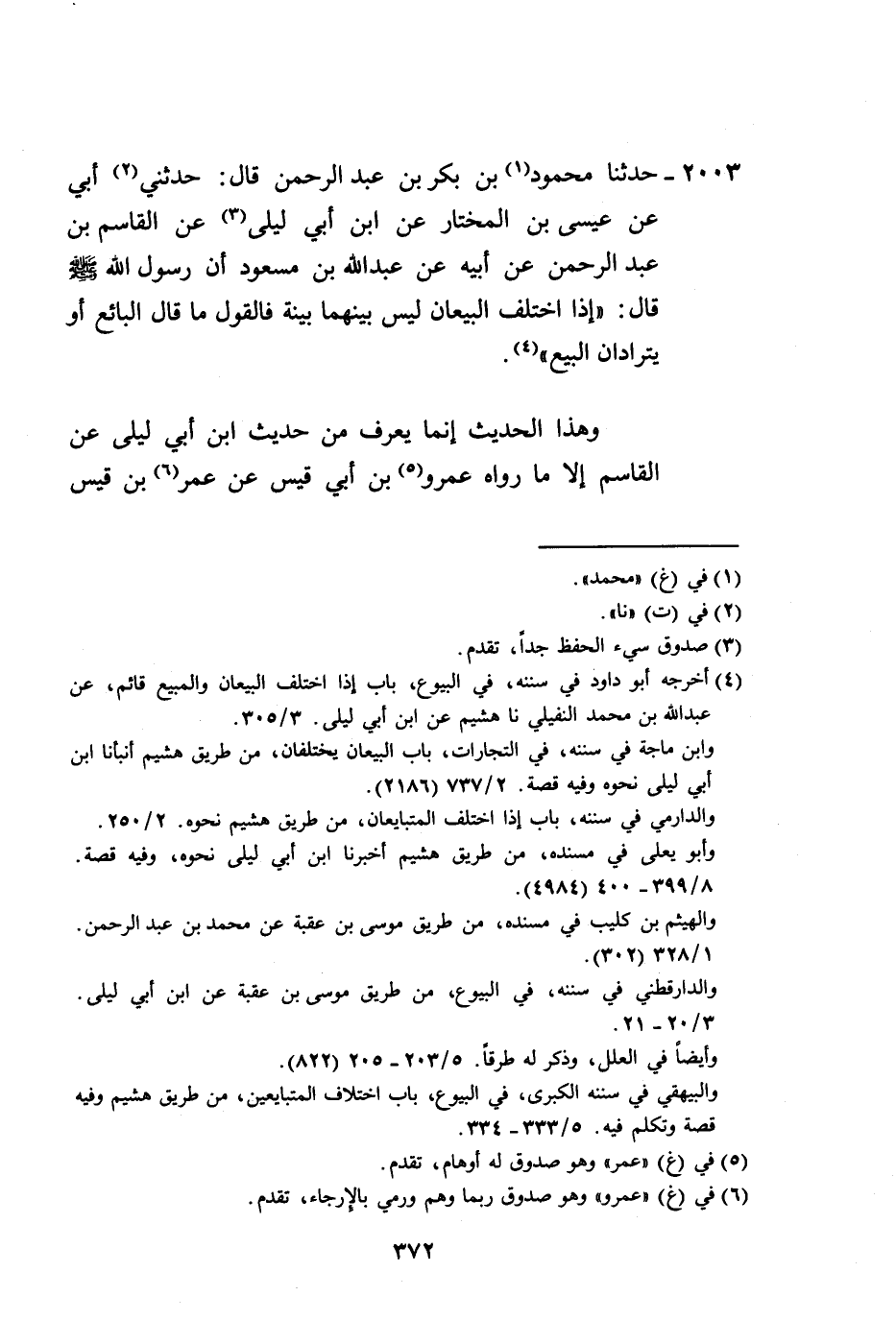 2003 - حَدَّثَنَا مَحْمُودُ بْنُ بَكْرِ بْنِ عَبْدِ الرَّحْمَنِ، قَالَ: حَدَّثَنِي أَبِي، عَنْ عِيسَى بْنِ الْمُخْتَارِ، عَنِ ابْنِ أَبِي لَيْلَى، عَنِ الْقَاسِمِ بْنِ عَبْدِ الرَّحْمَنِ، عَنْ أَبِيهِ، عَنْ عَبْدِ اللَّهِ بْنِ مَسْعُودٍ، أَنَّ رَسُولَ اللَّهِ صَلَّى اللهُ عَلَيْهِ وَسَلَّمَ قَالَ: «§إِذَا اخْتَلَفَ الْبَيِّعَانِ لَيْسَ بَيْنَهُمَا بَيِّنَةٌ، فَالْقَوْلُ مَا قَالَ الْبَائِعُ، أَوْ يَتَرَادَّانِ الْبَيْعَ» ، وَهَذَا الْحَدِيثُ إِنَّمَا يُعْرَفُ مِنْ حَدِيثِ ابْنِ أَبِي لَيْلَى، عَنِ الْقَاسِمِ إِلَّا مَا رَوَاهُ عَمْرُو بْنُ أَبِي قَيْسٍ، عَنْ عُمَرَ بْنِ قَيْسٍ -[373]- الْمَاصِرُ، عَنِ الْقَاسِمِ بْنِ عَبْدِ الرَّحْمَنِ، وَقَدْ رَوَى هَذَا الْحَدِيثَ غَيْرُ وَاحِدٍ عَنِ ابْنِ أَبِي لَيْلَى
