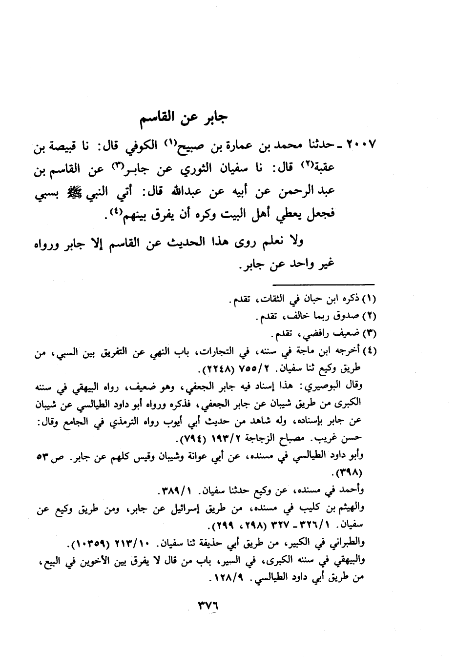 2007 - حَدَّثَنَا مُحَمَّدُ بْنُ عُمَارَةَ بْنِ صُبَيْحٍ الْكُوفِيُّ، قَالَ: نا قَبِيصَةُ بْنُ عُقْبَةَ، قَالَ: نا سُفْيَانُ الثَّوْرِيُّ، عَنْ جَابِرٍ، عَنِ الْقَاسِمِ بْنِ عَبْدِ الرَّحْمَنِ، عَنْ أَبِيهِ، عَنْ عَبْدِ اللَّهِ قَالَ: «§أُتِيَ النَّبِيُّ صَلَّى اللهُ عَلَيْهِ وَسَلَّمَ بِسَبْيٍ فَجَعَلَ يُعْطِي أَهْلَ الْبَيْتِ، وَكَرِهَ أَنْ يُفَرِّقَ بَيْنَهُمْ» ، وَلَا نَعْلَمُ رَوَى هَذَا الْحَدِيثَ عَنِ الْقَاسِمِ إِلَّا جَابِرٌ، وَرَوَاهُ غَيْرُ وَاحِدٍ، عَنْ جَابِرٍ