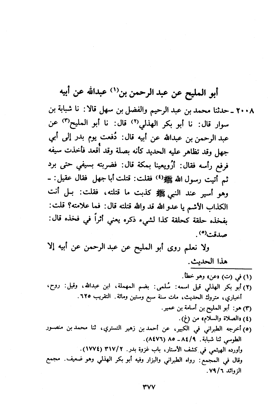 2008 - حَدَّثَنَا مُحَمَّدُ بْنُ عَبْدِ الرَّحِيمِ، وَالْفَضْلُ بْنُ سَهْلٍ، قَالَا: نا شَبَابَةُ بْنُ سَوَّارٍ، قَالَ: نا أَبُو بَكْرٍ الْهُذَلِيُّ، قَالَ: نا أَبُو الْمَلِيحِ، عَنْ عَبْدِ الرَّحْمَنِ بْنِ عَبْدِ اللَّهِ، عَنْ أَبِيهِ قَالَ: §دَفَعْتُ يَوْمَ بَدْرٍ إِلَى أَبِي جَهْلٍ وَقَدْ تَظَاهَرَ عَلَيْهِ الْحَدِيدُ كَأَنَّهُ بَصَلَةٌ، وَقَدْ أُقْعِدَ، فَأَخَذْتُ سَيْفَهُ، فَرَفَعَ رَأْسَهُ فَقَالَ: أَرُوَيْعِينَا بِمَكَّةَ؟ قَالَ: فَضَرَبْتُهُ بِسَيْفِي حَتَّى بَرَدَ، ثُمَّ أَتَيْتُ رَسُولَ اللَّهِ صَلَّى اللهُ عَلَيْهِ وَسَلَّمَ، فَقُلْتُ: قَتَلْتُ أَبَا جَهْلٍ، فَقَالَ عَقِيلٌ وَهُوَ أَسِيرٌ عِنْدَ النَّبِيِّ صَلَّى اللهُ عَلَيْهِ وَسَلَّمَ: كَذَبْتَ مَا قَتَلْتَهُ، فَقُلْتُ: «بَلْ أَنْتَ الْكَذَّابُ الْأَشَمُّ يَا عَدُوَّ اللَّهِ، قَدْ وَاللَّهِ قَتَلْتُهُ» ، قَالَ: فَمَا عَلَامَتُهُ؟ قُلْتُ: «بِفَخِذِهِ حَلْقَةٌ كَحَلْقَةِ كَذَا لِشَيْءٍ ذَكَرَهُ يَعْنِي أَثَرًا فِي فَخِذِهِ» ، قَالَ: صَدَقْتَ، وَلَا نَعْلَمُ رَوَى أَبُو الْمَلِيحِ، عَنْ عَبْدِ الرَّحْمَنِ، عَنْ أَبِيهِ إِلَّا هَذَا الْحَدِيثَ