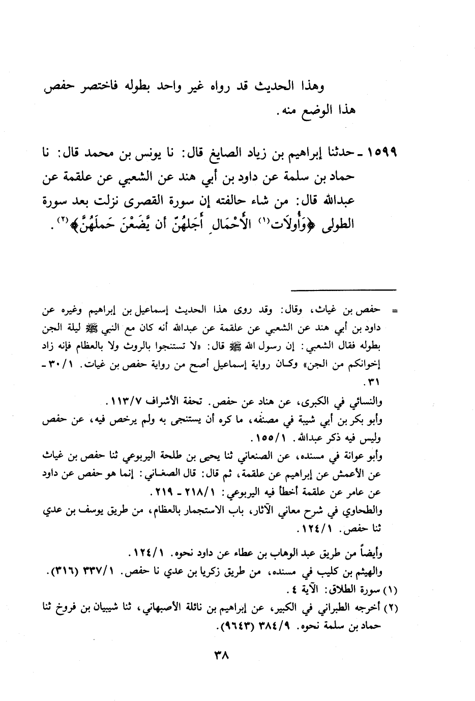 1599 - حَدَّثَنَا إِبْرَاهِيمُ بْنُ زِيَادٍ الصَّايِغُ، قَالَ: نا يُونُسُ بْنُ مُحَمَّدٍ، قَالَ: نا حَمَّادُ بْنُ سَلَمَةَ، عَنْ دَاوُدَ بْنِ أَبِي هِنْدٍ، عَنِ الشَّعْبِيِّ، عَنْ عَلْقَمَةَ، عَنْ عَبْدِ اللَّهِ قَالَ: " §مَنْ شَاءَ حَالَفْتُهُ إِنَّ سُورَةَ الْقُصْرَى نَزَلَتْ بَعْدَ سُورَةِ الطُّولَى {وَأُولَاتُ الْأَحْمَالِ أَجَلُهُنَّ أَنْ يَضَعْنَ حَمْلَهُنَّ} [الطلاق: 4]