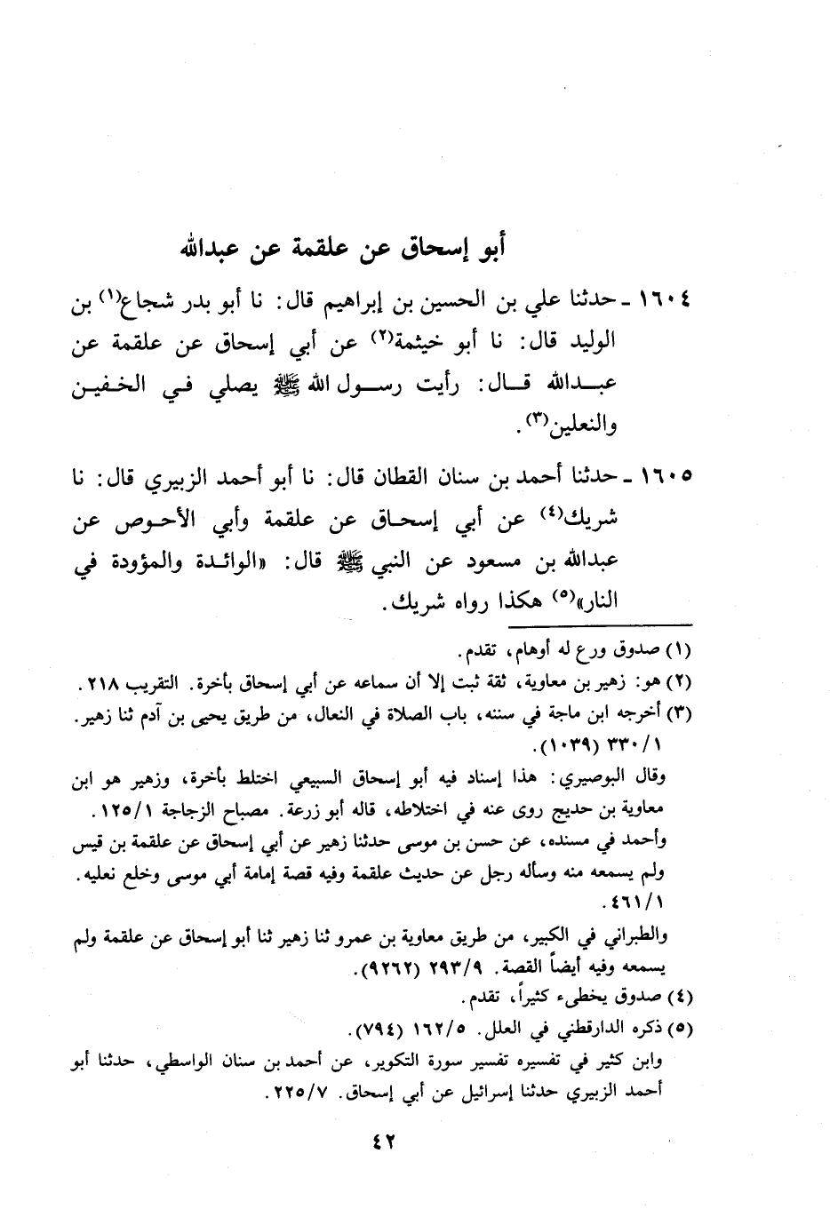 1604 - حَدَّثَنَا عَلِيُّ بْنُ الْحُسَيْنِ بْنِ إِبْرَاهِيمَ، قَالَ: نا أَبُو بَدْرٍ شُجَاعُ بْنُ الْوَلِيدِ، قَالَ: نا أَبُو خَيْثَمَةَ، عَنْ أَبِي إِسْحَاقَ، عَنْ عَلْقَمَةَ، عَنْ عَبْدِ اللَّهِ قَالَ: «رَأَيْتُ رَسُولَ اللَّهِ صَلَّى اللهُ عَلَيْهِ وَسَلَّمَ §يُصَلَّى فِي الْخُفَّيْنِ وَالنَّعْلَيْنِ»