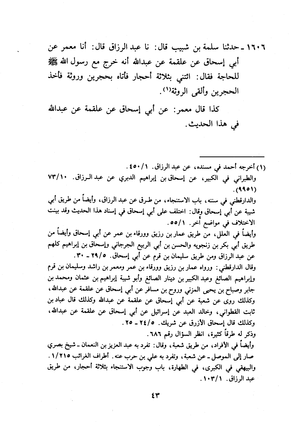 1606 - حَدَّثَنَا سَلَمَةُ بْنُ شَبِيبٍ، قَالَ: نا عَبْدُ الرَّزَّاقِ، قَالَ: أنَا مَعْمَرٌ، عَنْ أَبِي إِسْحَاقَ، عَنْ عَلْقَمَةَ، عَنْ عَبْدِ اللَّهِ، أَنَّهُ خَرَجَ مَعَ رَسُولِ اللَّهِ صَلَّى اللهُ عَلَيْهِ وَسَلَّمَ لِلْحَاجَةِ فَقَالَ: «§ائْتِنِي بِثَلَاثَةِ أَحْجَارٍ» ، فَأَتَاهُ بِحَجَرَيْنِ وَرَوْثَةٍ، فَأَخَذَ الْحَجَرَيْنِ وَأَلْقَى الرَّوْثَةَ، كَذَا قَالَ مَعْمَرٌ، عَنْ أَبِي إِسْحَاقَ، عَنْ عَلْقَمَةَ، عَنْ عَبْدِ اللَّهِ فِي هَذَا الْحَدِيثِ