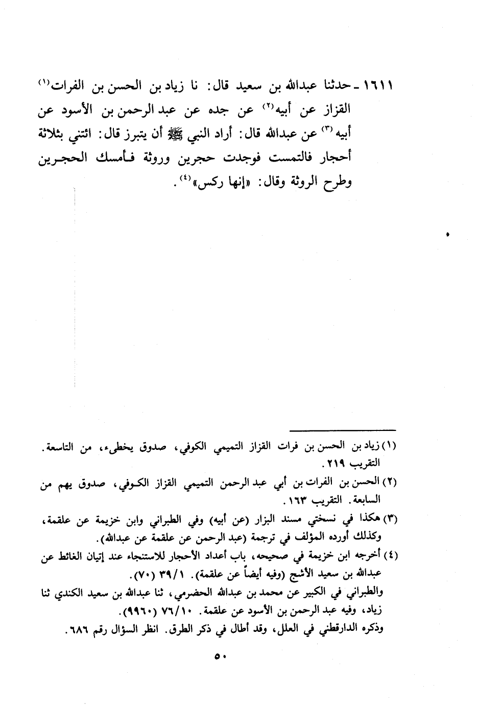 1611 - حَدَّثَنَا عَبْدُ اللَّهِ بْنُ سَعِيدٍ، قَالَ: نا زِيَادُ بْنُ الْحَسَنِ بْنِ الْفُرَاتِ الْقَزَّازُ، عَنْ أَبِيهِ، عَنْ جَدِّهِ، عَنْ عَبْدِ الرَّحْمَنِ بْنِ الْأَسْوَدِ، عَنْ أَبِيهِ، عَنْ عَبْدِ اللَّهِ قَالَ: أَرَادَ النَّبِيُّ صَلَّى اللهُ عَلَيْهِ وَسَلَّمَ أَنْ يَتَبَرَّزَ قَالَ: «§ائْتِنِي بِثَلَاثَةِ أَحْجَارٍ» ، فَالْتَمَسْتُ فَوَجَدْتُ حَجَرَيْنِ وَرَوْثَةً، فَأَمْسَكَ الْحَجَرَيْنِ وَطَرَحَ الرَّوْثَةَ، وَقَالَ: «إِنَّهَا رِكْسٌ»
