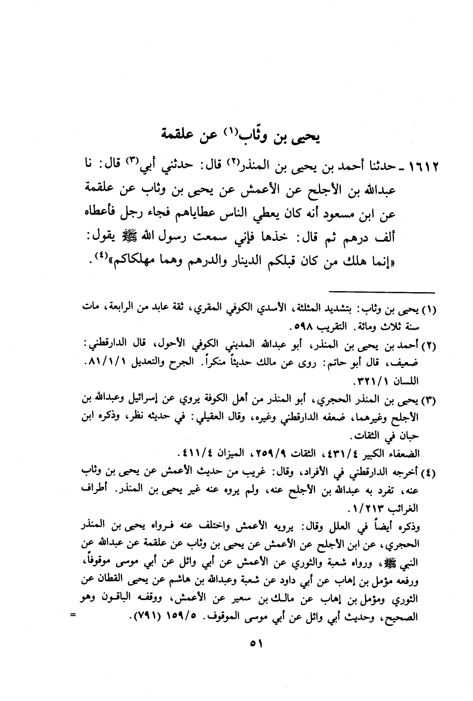 1612 - حَدَّثَنَا أَحْمَدُ بْنُ يَحْيَى بْنِ الْمُنْذِرِ، قَالَ: حَدَّثَنِي أَبِي، قَالَ: نا عَبْدُ اللَّهِ بْنُ الْأَجْلَحَ، عَنِ الْأَعْمَشِ، عَنْ يَحْيَى بْنِ وَثَّابٍ، عَنْ عَلْقَمَةَ، عَنِ ابْنِ مَسْعُودٍ، أَنَّهُ كَانَ يُعْطِي النَّاسَ عَطَايَاهُمْ، فَجَاءَ رَجُلٌ فَأَعْطَاهُ أَلْفَ دِرْهَمٍ ثُمَّ قَالَ: خُذْهَا فَإِنِّي سَمِعْتُ رَسُولَ اللَّهِ صَلَّى اللهُ عَلَيْهِ وَسَلَّمَ يَقُولُ: «§إِنَّمَا هَلَكَ مَنْ كَانَ قَبْلَكُمُ الدِّينَارُ وَالدِّرْهَمُ وَهُمَا مُهْلِكَاكُمْ» -[52]-،