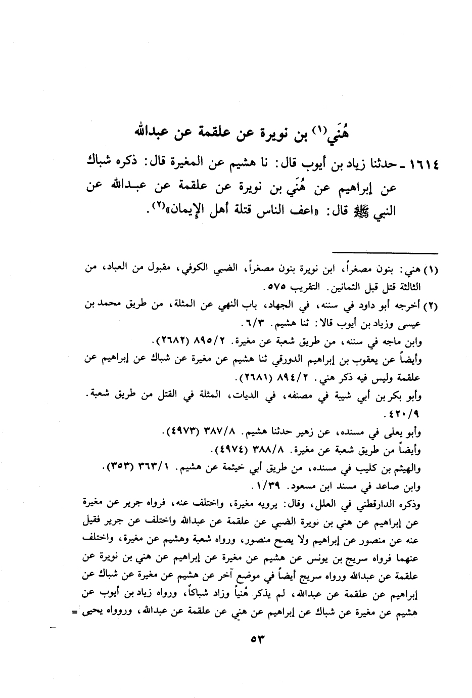1614 - حَدَّثَنَا زِيَادُ بْنُ أَيُّوبَ، قَالَ: نا هُشَيْمٌ، عَنِ الْمُغِيرَةِ، قَالَ: ذَكَرَهُ شِبَاكٌ، عَنْ إِبْرَاهِيمَ، عَنْ هُنَيِّ بْنِ نُوَيْرَةَ، عَنْ عَلْقَمَةَ، عَنْ عَبْدِ اللَّهِ، عَنِ النَّبِيِّ صَلَّى اللهُ عَلَيْهِ وَسَلَّمَ قَالَ: «§أَعَفُّ النَّاسِ قِتْلَةً أَهْلُ الْإِيمَانِ» -[54]-،