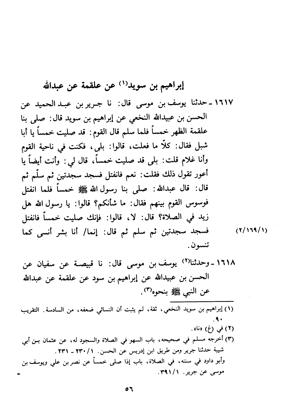 1617 - حَدَّثَنَا يُوسُفُ بْنُ مُوسَى، قَالَ: نا جَرِيرُ بْنُ عَبْدِ الْحَمِيدِ، عَنِ الْحَسَنِ بْنِ عُبَيْدِ اللَّهِ النَّخَعِيِّ، عَنْ إِبْرَاهِيمَ بْنِ سُوَيْدٍ قَالَ: صَلَّى بِنَا عَلْقَمَةُ الظُّهْرَ خَمْسًا، فَلَمَّا سَلَّمَ قَالَ الْقَوْمُ: قَدْ صَلَّيْتَ خَمْسًا يَا أَبَا شِبْلٍ، فَقَالَ: كَلَّا مَا فَعَلْتُ، قَالُوا: بَلَى، فَكُنْتُ فِي نَاحِيَةِ الْقَوْمِ وَأَنَا غُلَامٌ، قُلْتُ: بَلَى، قَدْ صَلَّيْتَ خَمْسًا، قَالَ لِي: وَأَنْتَ أَيْضًا يَا أَعْوَرُ تَقُولُ ذَلِكَ، فَقُلْتُ: نَعَمْ، فَانْفَتَلَ فَسَجَدَ سَجْدَتَيْنِ ثُمَّ سَلَّمَ، ثُمَّ قَالَ: قَالَ عَبْدُ اللَّهِ: صَلَّى بِنَا رَسُولُ اللَّهِ صَلَّى اللهُ عَلَيْهِ وَسَلَّمَ خَمْسًا فَلَمَّا انْفَتَلَ فَوَسْوَسَ الْقَوْمُ بَيْنَهُمْ، فَقَالَ: «مَا شَأْنُكُمْ؟» ، قَالُوا: يَا رَسُولَ اللَّهِ، هَلْ زِيدَ فِي الصَّلَاةِ؟ قَالَ: «لَا» ، قَالُوا: فَإِنَّكَ صَلَّيْتَ خَمْسًا، فَانْفَتَلَ فَسَجَدَ سَجْدَتَيْنِ، ثُمَّ سَلَّمَ، ثُمَّ قَالَ: «§إِنَّمَا أَنَا بَشَرٌ أَنْسَى كَمَا تَنْسَوْنَ» ،