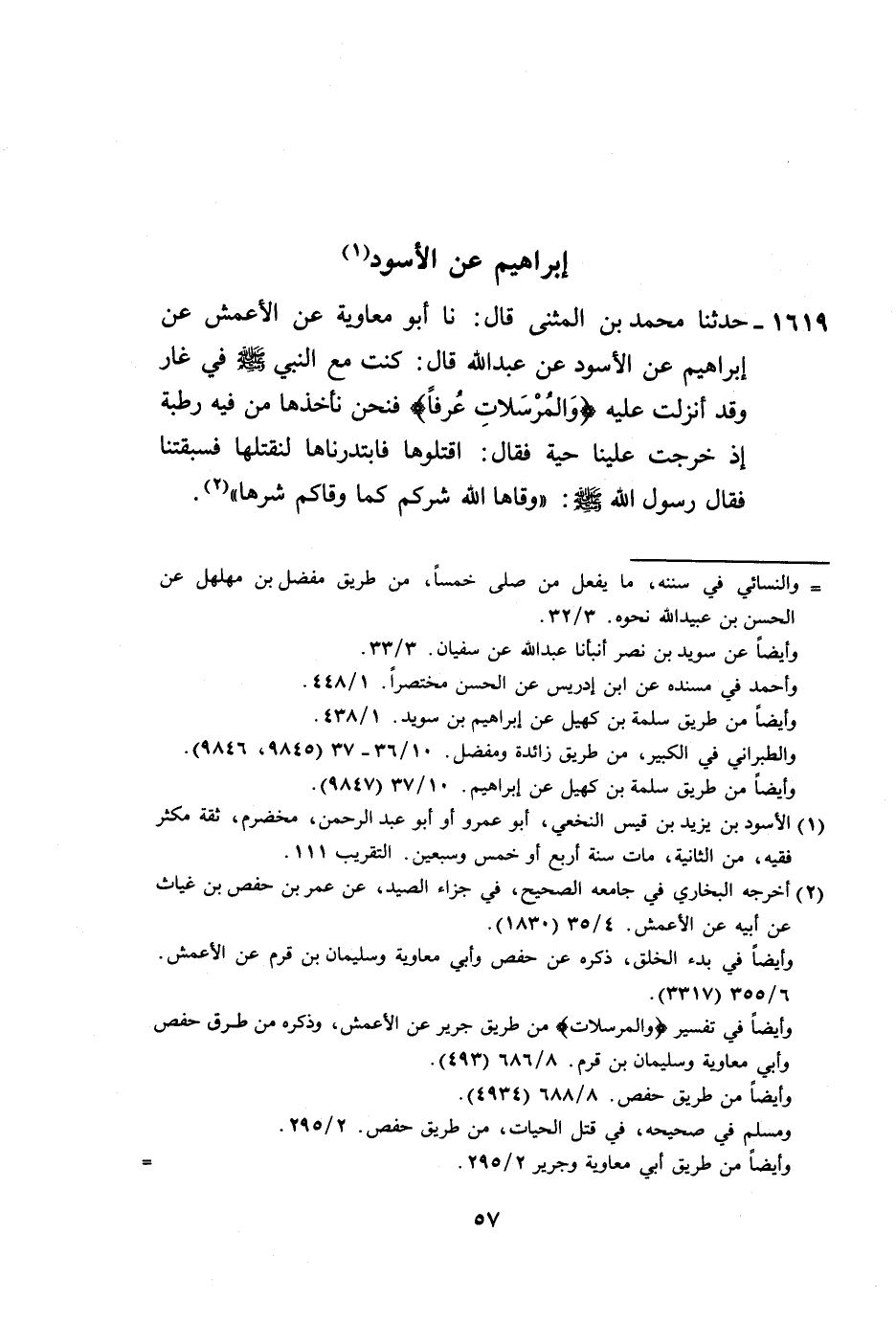 1619 - حَدَّثَنَا مُحَمَّدُ بْنُ الْمُثَنَّى، قَالَ: نا أَبُو مُعَاوِيَةَ، عَنِ الْأَعْمَشِ، عَنْ إِبْرَاهِيمَ، عَنِ الْأَسْوَدِ، عَنْ عَبْدِ اللَّهِ قَالَ: كُنْتُ مَعَ النَّبِيِّ صَلَّى اللهُ عَلَيْهِ وَسَلَّمَ فِي غَارٍ وَقَدْ أُنْزِلَتْ عَلَيْهِ وَالْمُرْسَلَاتِ عُرْفًا، فَنَحْنُ نَأْخُذُهَا مِنْ فِيهِ رَطْبَةً §إِذْ خَرَجَتْ عَلَيْنَا حَيَّةٌ، فَقَالَ: «اقْتُلُوهَا» فَابْتَدَرْنَاهَا لِنَقْتُلَهَا فَسَبَقَتْنَا، فَقَالَ رَسُولُ اللَّهِ صَلَّى اللهُ عَلَيْهِ وَسَلَّمَ: «وَقَاهَا اللَّهُ شَرَّكُمْ كَمَا وَقَاكُمْ شَرِّهَا» -[58]- وَهَذَا الْحَدِيثُ قَدْ رَوَاهُ إِسْرَائِيلُ فَقَالَ: عَنِ الْأَعْمَشِ، عَنْ إِبْرَاهِيمَ، عَنْ عَلْقَمَةَ، وَالْأَسْوَدِ