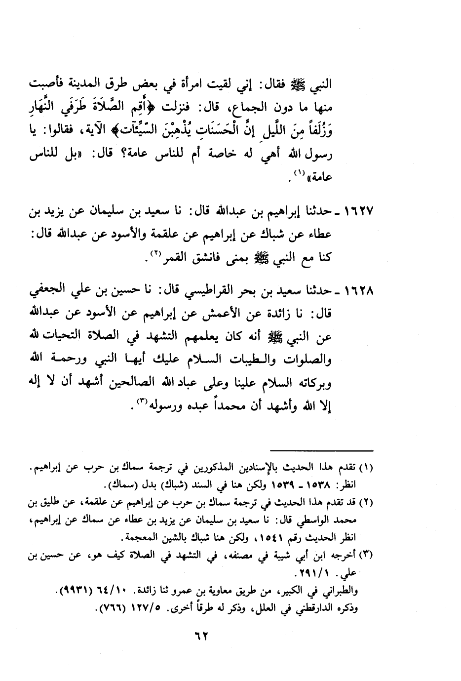 1628 - حَدَّثَنَا سَعِيدُ بْنُ بَحْرٍ الْقَرَاطِيسِيُّ، قَالَ: نا حُسَيْنُ بْنُ عَلِيٍّ الْجُعْفِيُّ، قَالَ: نا زَائِدَةُ، عَنِ الْأَعْمَشِ، عَنْ إِبْرَاهِيمَ، عَنِ الْأَسْوَدِ، عَنْ عَبْدِ اللَّهِ، عَنِ النَّبِيِّ صَلَّى اللهُ عَلَيْهِ وَسَلَّمَ أَنَّهُ " كَانَ §يُعَلِّمُهُمُ التَّشَهُّدَ فِي الصَّلَاةِ: التَّحِيَّاتُ لِلَّهِ وَالصَّلَوَاتُ وَالطَّيِّبَاتُ، السَّلَامُ عَلَيْكَ أَيُّهَا النَّبِيُّ وَرَحْمَةُ اللَّهِ وَبَرَكَاتُهُ، السَّلَامُ عَلَيْنَا وَعَلَى عَبَّادِ اللَّهِ الصَّالِحِينَ، أَشْهَدُ أَنْ لَا إِلَهَ إِلَّا اللَّهُ، وَأَشْهَدُ أَنَّ مُحَمَّدًا عَبْدُهُ وَرَسُولُهُ " -[63]-، وَهَذَا الْحَدِيثُ لَا نَعْلَمُ رَوَاهُ عَنِ الْأَعْمَشِ، عَنْ إِبْرَاهِيمَ، عَنِ الْأَسْوَدِ، عَنْ عَبْدِ اللَّهِ إِلَّا زَائِدَةُ، وَلَا عَنْ زَائِدَةَ إِلَّا حُسَيْنُ بْنُ عَلِيٍّ الْجُعْفِيٍّ