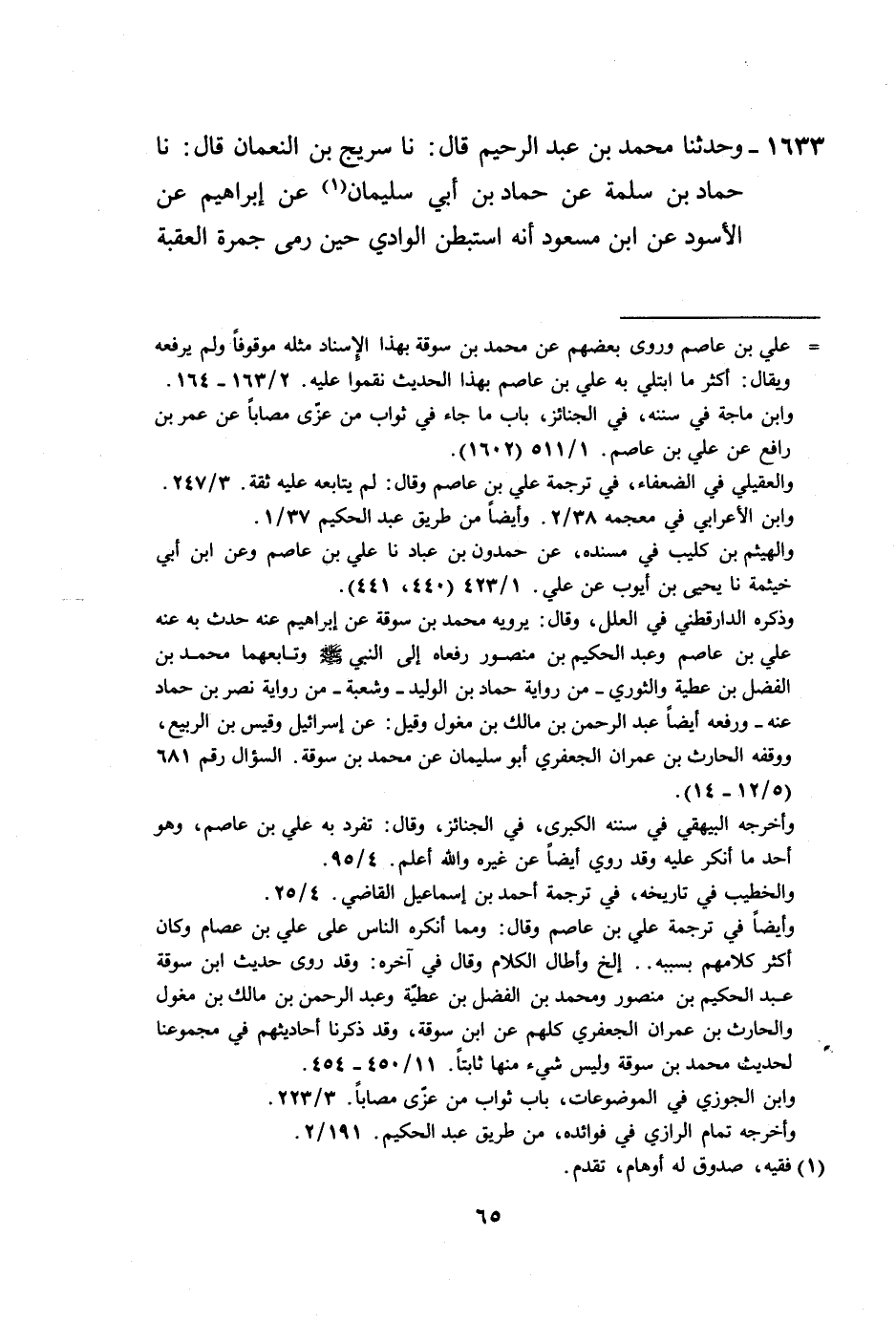 1633 - وَحَدَّثَنَا مُحَمَّدُ بْنُ عَبْدِ الرَّحِيمِ، قَالَ: نا سُرَيْجُ بْنُ النُّعْمَانِ، قَالَ: نا حَمَّادُ بْنُ سَلَمَةَ، عَنْ حَمَّادِ بْنِ أَبِي سُلَيْمَانَ، عَنْ إِبْرَاهِيمَ، عَنِ الْأَسْوَدِ، عَنِ ابْنِ مَسْعُودٍ، أَنَّهُ §اسْتَبْطَنَ الْوَادِيَ حِينَ رَمَى جَمْرَةَ الْعَقَبَةِ -[66]-، وَجَعَلَ الْجَبَلَ خَلْفَ ظَهْرِهِ، ثُمَّ رَمَى، وَقَالَ: «هَذَا مَقَامُ الَّذِي أُنْزِلَ عَلَيْهِ سُورَةُ الْبَقَرَةِ» ، وَهَذَا الْحَدِيثُ رَوَاهُ غَيْرُ وَاحِدٍ، عَنْ إِبْرَاهِيمَ، عَنْ عَبْدِ الرَّحْمَنِ بْنِ يَزِيدَ، وَهَكَذَا رَوَاهُ سُرَيْجُ، عَنْ حَمَّادٍ، فِيمَا حَدَّثَنَاهُ مُحَمَّدُ بْنُ عَبْدِ الرَّحِيمِ