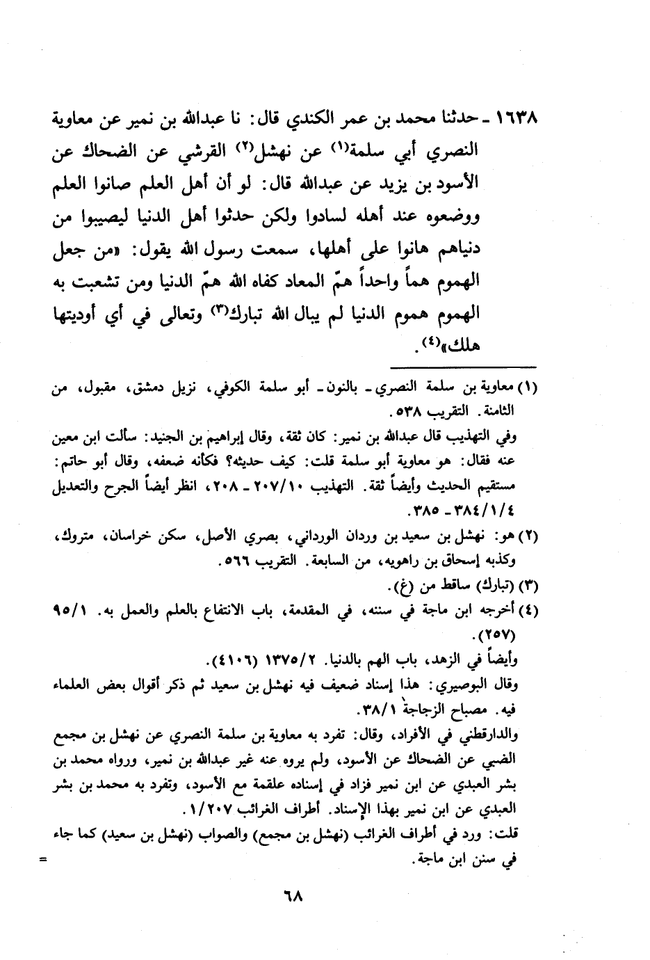 1638 - حَدَّثَنَا مُحَمَّدُ بْنُ عُمَرَ الْكِنْدِيُّ، قَالَ: نا عَبْدُ اللَّهِ بْنُ نُمَيْرٍ، عَنْ مُعَاوِيَةَ النَّصْرِيِّ أَبِي سَلَمَةَ، عَنْ نَهْشَلٍ الْقُرَشِيِّ، عَنِ الضَّحَّاكِ، عَنِ الْأَسْوَدِ بْنِ يَزِيدَ، عَنْ عَبْدِ اللَّهِ قَالَ: لَوْ أَنَّ أَهْلَ الْعِلْمِ صَانُوا الْعِلْمَ وَوَضَعُوهُ عِنْدَ أَهْلِهِ لَسَادُوا، وَلَكِنْ حَدِّثُوا أَهْلَ الدُّنْيَا لِيَصِيبُوا مِنْ دُنْيَاهُمْ هَانُوا عَلَى أَهْلِهَا، سَمِعْتُ رَسُولَ اللَّهِ يَقُولُ: «§مَنْ جَعَلَ الْهُمُومَ هَمًّا وَاحِدًا هَمَّ الْمَعَادِ كَفَاهُ اللَّهُ هَمَّ الدُّنْيَا، وَمَنْ تَشَعَّبَتْ بِهِ الْهُمُومُ هُمُومٌ الدُّنْيَا لَمْ يُبَالِ اللَّهُ تَبَارَكَ وَتَعَالَى فِي أَيِّ أَوْدِيَتِهَا هَلَكَ»