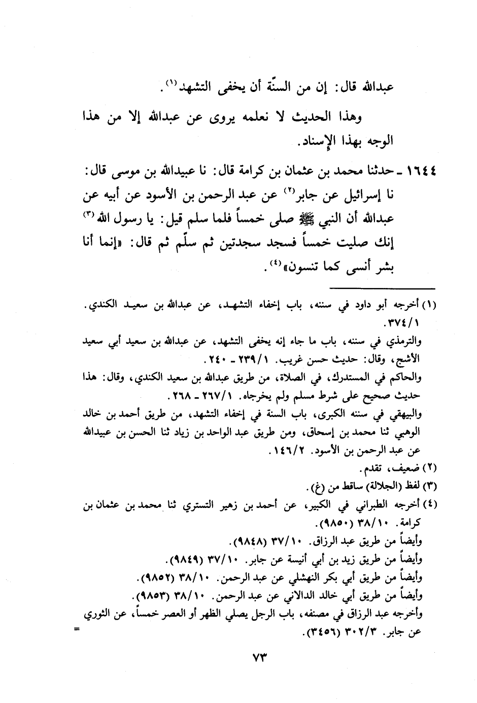 1644 - حَدَّثَنَا مُحَمَّدُ بْنُ عُثْمَانَ بْنِ كَرَامَةَ، قَالَ: نا عُبَيْدُ اللَّهِ بْنُ مُوسَى، قَالَ: نا إِسْرَائِيلُ، عَنْ جَابِرٍ، عَنْ عَبْدِ الرَّحْمَنِ بْنِ الْأَسْوَدِ، عَنْ أَبِيهِ، عَنْ عَبْدِ اللَّهِ، أَنَّ النَّبِيَّ صَلَّى اللهُ عَلَيْهِ وَسَلَّمَ صَلَّى خَمْسًا فَلَمَّا سَلَّمَ قِيلَ: يَا رَسُولَ اللَّهِ، إِنَّكَ صَلَّيْتَ خَمْسًا، فَسَجَدَ سَجْدَتَيْنِ، ثُمَّ سَلَّمَ، ثُمَّ قَالَ: «§إِنَّمَا أَنَا بَشَرٌ أَنْسَى كَمَا تَنْسَوْنَ»