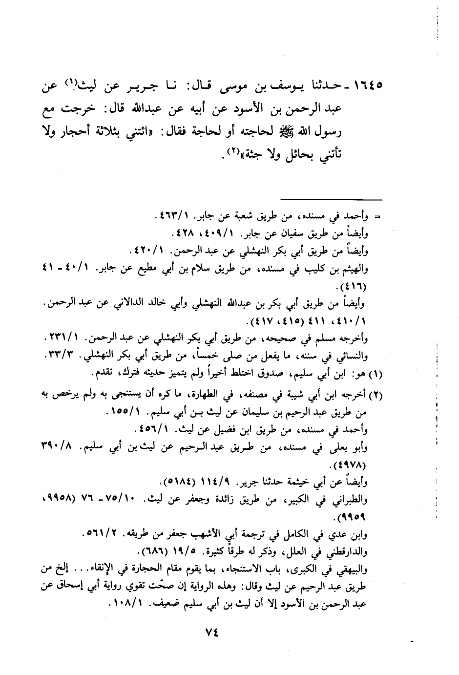 1645 - حَدَّثَنَا يُوسُفُ بْنُ مُوسَى، قَالَ: نا جَرِيرٌ، عَنْ لَيْثٍ، عَنْ عَبْدِ الرَّحْمَنِ بْنِ الْأَسْوَدِ، عَنْ أَبِيهِ، عَنْ عَبْدِ اللَّهِ قَالَ: خَرَجْتُ مَعَ رَسُولِ اللَّهِ صَلَّى اللهُ عَلَيْهِ وَسَلَّمَ لِحَاجَتِهِ أَوِ لِحَاجَةٍ، فَقَالَ: «§ائْتِنِي بِثَلَاثَةِ أَحْجَارٍ، وَلَا تَأْتِنِي بِحَائِلٍ وَلَا جُثَّةٍ»