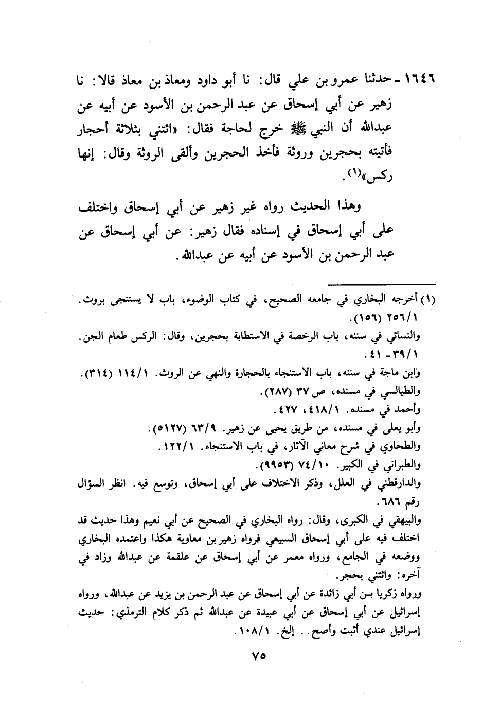 1646 - حَدَّثَنَا عَمْرُو بْنُ عَلِيٍّ، قَالَ: نا أَبُو دَاوُدَ، وَمُعَاذُ بْنُ مُعَاذٍ، قَالَا: نا زُهَيْرٌ، عَنْ أَبِي إِسْحَاقَ، عَنْ عَبْدِ الرَّحْمَنِ بْنِ الْأَسْوَدِ، عَنْ أَبِيهِ، عَنْ عَبْدِ اللَّهِ، أَنَّ النَّبِيَّ صَلَّى اللهُ عَلَيْهِ وَسَلَّمَ خَرَجَ لِحَاجَةٍ، فَقَالَ: «§ائْتِنِي بِثَلَاثَةِ أَحْجَارٍ» ، فَأَتَيْتُهُ بِحَجَرَيْنِ وَرَوْثَةٍ، فَأَخَذَ الْحَجَرَيْنِ وَأَلْقَى الرَّوْثَةَ، وَقَالَ: «إِنَّهَا رِكْسٌ» ، وَهَذَا الْحَدِيثُ رَوَاهُ غَيْرُ زُهَيْرٍ، عَنْ أَبِي إِسْحَاقَ، وَاخْتُلِفَ عَلَى أَبِي إِسْحَاقَ فِي إِسْنَادِهِ، فَقَالَ زُهَيْرٌ: عَنْ أَبِي إِسْحَاقَ، عَنْ عَبْدِ الرَّحْمَنِ بْنِ الْأَسْوَدِ، عَنْ أَبِيهِ، عَنْ عَبْدِ اللَّهِ -[76]-: وَقَالَ الثَّوْرِيُّ: عَنْ أَبِي إِسْحَاقَ، عَنْ أَبِي عُبَيْدَةَ، عَنْ عَبْدِ اللَّهِ، وَقَالَ مَعْمَرٌ: عَنْ أَبِي إِسْحَاقَ، عَنْ عَلْقَمَةَ، عَنْ عَبْدِ اللَّهِ، وَقَالَ زَكَرِيَّا بْنُ أَبِي زَائِدَةَ: عَنْ أَبِي إِسْحَاقَ، عَنْ عَبْدِ الرَّحْمَنِ بْنِ يَزِيدَ