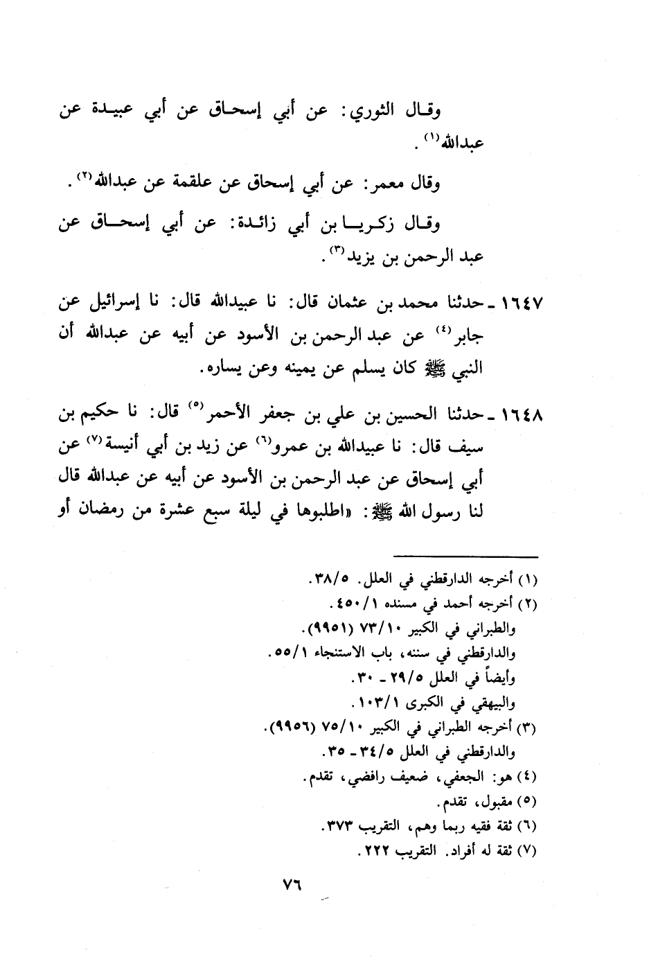 1648 - حَدَّثَنَا الْحُسَيْنُ بْنُ عَلِيِّ بْنِ جَعْفَرٍ الْأَحْمَرُ، قَالَ: نا حَكِيمُ بْنُ سَيْفٍ، قَالَ: نا عُبَيْدُ اللَّهِ بْنُ عَمْرٍو، عَنْ زَيْدِ بْنِ أَبِي أُنَيْسَةَ، عَنْ أَبِي إِسْحَاقَ، عَنْ عَبْدِ الرَّحْمَنِ بْنِ الْأَسْوَدِ، عَنْ أَبِيهِ، عَنْ عَبْدِ اللَّهِ، قَالَ لَنَا رَسُولُ اللَّهِ صَلَّى اللهُ عَلَيْهِ وَسَلَّمَ: «§اطْلُبُوهَا فِي لَيْلَةِ سَبْعَ عَشْرَةَ مِنْ رَمَضَانَ، أَوْ -[77]- لَيْلَةَ إِحْدَى وَعِشْرِينَ، أَوِ لَيْلَةَ ثَلَاثٍ وَعِشْرِينَ» ، ثُمَّ سَكَتَ، وَهَذَا الْحَدِيثُ لَا نَعْلَمُ رَوَاهُ عَنْ أَبِي إِسْحَاقَ بِهَذَا الْإِسْنَادِ إِلَّا زَيْدُ بْنُ أَبِي أُنَيْسَةَ