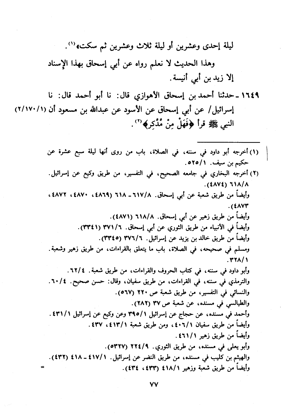 1649 - حَدَّثَنَا أَحْمَدُ بْنُ إِسْحَاقَ الْأَهْوَازِيُّ، قَالَ: نا أَبُو أَحْمَدَ، قَالَ: نا إِسْرَائِيلُ، عَنْ أَبِي إِسْحَاقَ، عَنِ الْأَسْوَدِ، عَنْ عَبْدِ اللَّهِ بْنِ مَسْعُودٍ، " أَنَّ النَّبِيَّ صَلَّى اللهُ عَلَيْهِ وَسَلَّمَ §قَرَأَ {فَهَلْ مِنْ مُدَّكِرٍ} [القمر: 15] "