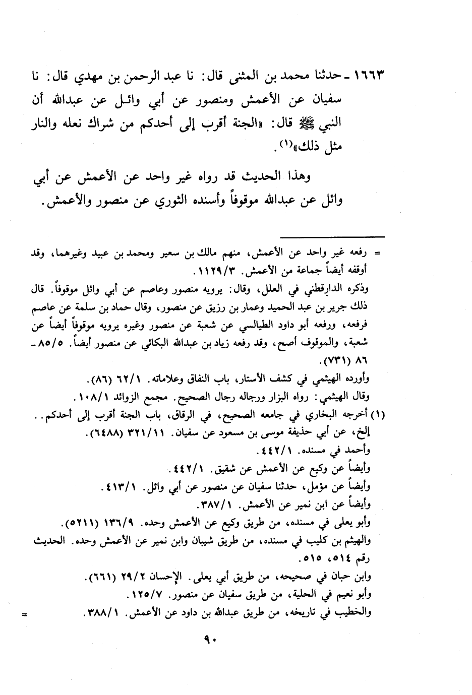 1663 - حَدَّثَنَا مُحَمَّدُ بْنُ الْمُثَنَّى، قَالَ: نا عَبْدُ الرَّحْمَنِ بْنُ مَهْدِيٍّ، قَالَ: نا سُفْيَانُ، عَنِ الْأَعْمَشِ، وَمَنْصُورٍ، عَنْ أَبِي وَائِلٍ، عَنْ عَبْدِ اللَّهِ، أَنَّ النَّبِيَّ صَلَّى اللهُ عَلَيْهِ وَسَلَّمَ قَالَ: «§الْجَنَّةُ أَقْرَبُ إِلَى أَحَدِكُمْ مِنْ شِرَاكِ نَعْلِهِ وَالنَّارُ مِثْلُ ذَلِكَ» ، وَهَذَا الْحَدِيثُ قَدْ رَوَاهُ غَيْرُ وَاحِدٍ عَنِ الْأَعْمَشِ، عَنْ أَبِي وَائِلٍ، عَنْ عَبْدِ اللَّهِ مَوْقُوفًا، وَأَسْنَدَهُ الثَّوْرِيُّ، عَنْ مَنْصُورٍ، وَالْأَعْمَشِ