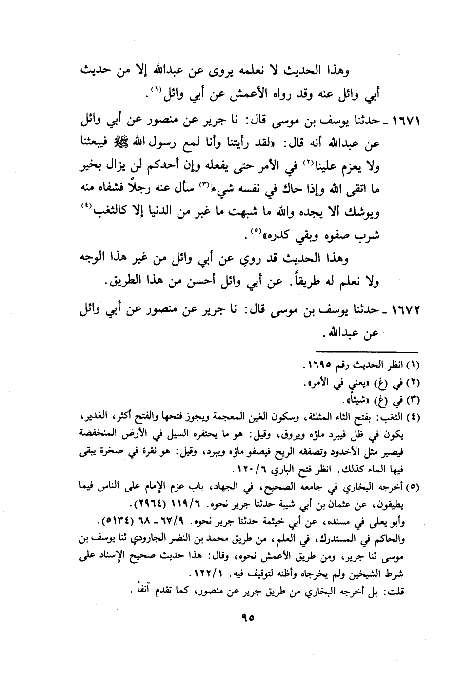 1672 - حَدَّثَنَا يُوسُفُ بْنُ مُوسَى، قَالَ: نا جَرِيرٌ، عَنْ مَنْصُورٍ، عَنْ أَبِي وَائِلٍ، عَنْ عَبْدِ اللَّهِ -[96]-،