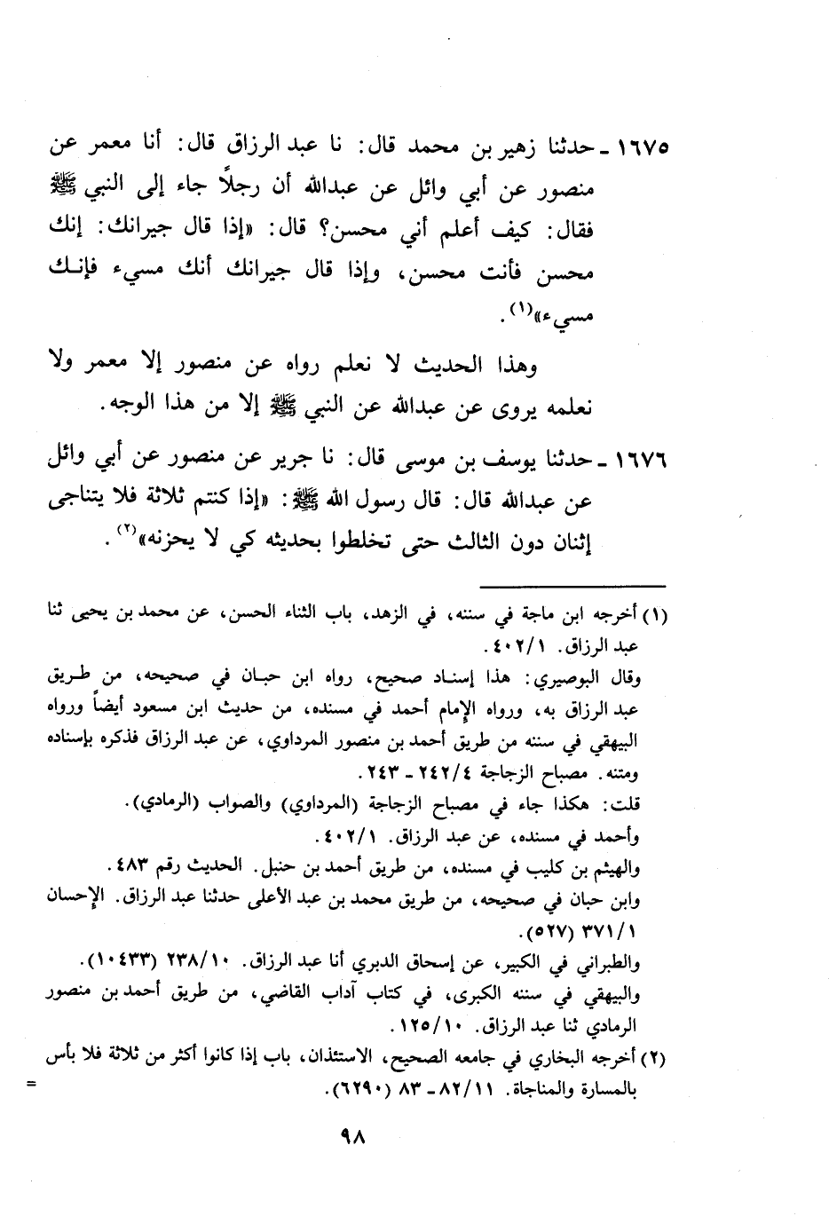 1675 - حَدَّثَنَا زُهَيْرُ بْنُ مُحَمَّدٍ، قَالَ: نا عَبْدُ الرَّزَّاقِ، قَالَ: أنَا مَعْمَرٌ، عَنْ مَنْصُورٍ، عَنْ أَبِي وَائِلٍ، عَنْ عَبْدِ اللَّهِ، أَنَّ رَجُلًا جَاءَ إِلَى النَّبِيِّ صَلَّى اللهُ عَلَيْهِ وَسَلَّمَ فَقَالَ: كَيْفَ أَعْلَمُ أَنِّي مُحْسِنٌ؟ قَالَ: " §إِذَا قَالَ جِيرَانُكَ: إِنَّكَ مُحْسِنٌ فَأَنْتَ مُحْسِنٌ، وَإِذَا قَالَ جِيرَانُكَ: إِنَّكَ مُسِيءٌ فَإِنَّكَ مُسِيءٌ "، وَهَذَا الْحَدِيثُ لَا نَعْلَمُ رَوَاهُ عَنْ مَنْصُورٍ إِلَّا مَعْمَرٌ وَلَا نَعْلَمُهُ يُرْوَى، عَنْ عَبْدِ اللَّهِ، عَنِ النَّبِيِّ صَلَّى اللهُ عَلَيْهِ وَسَلَّمَ إِلَّا مِنْ هَذَا الْوَجْهِ