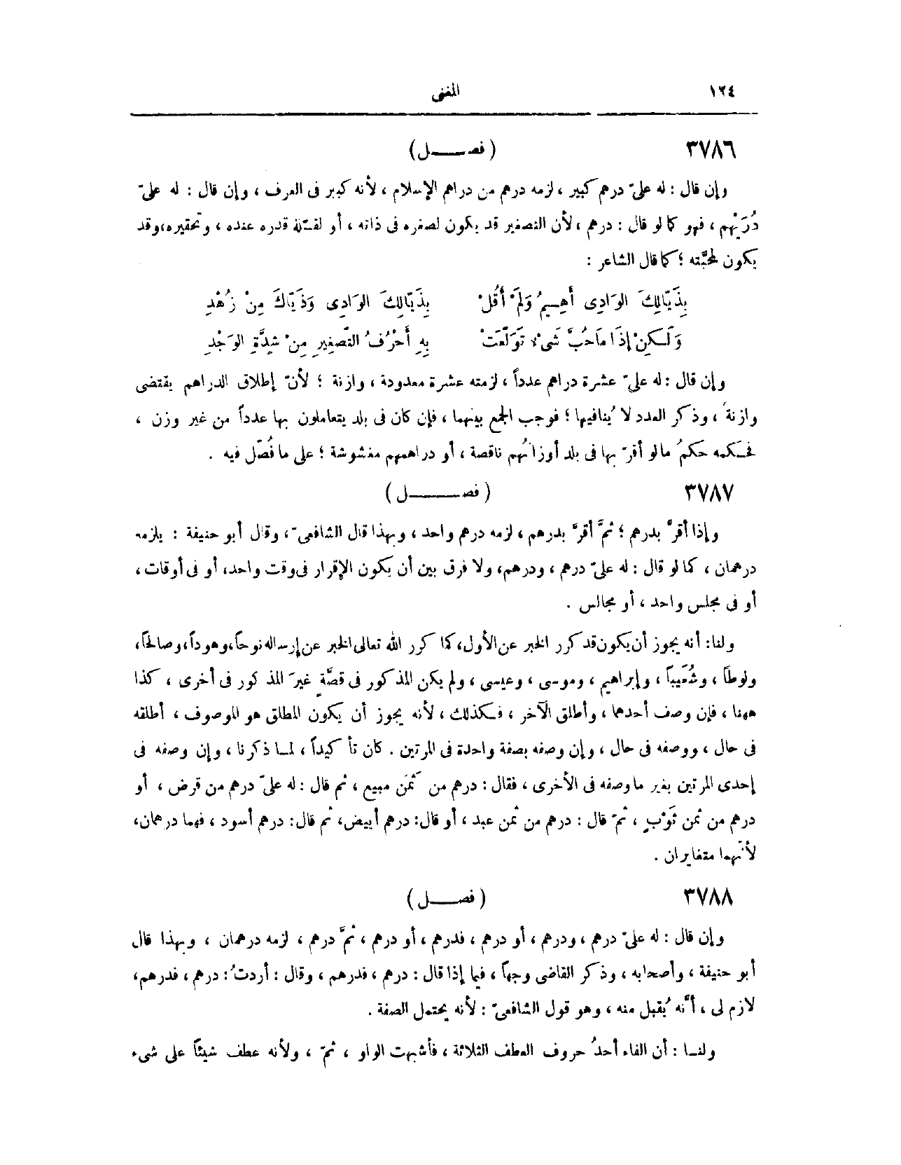 (٣٨٤٠) فَصْلٌ: وَإِنْ قَالَ: لَهُ عَلَيَّ دِرْهَمٌ كَبِيرٌ. لَزِمَهُ دِرْهَمٌ مِنْ دَرَاهِمِ الْإِسْلَامِ؛ لِأَنَّهُ كَبِيرٌ فِي الْعُرْفِ.