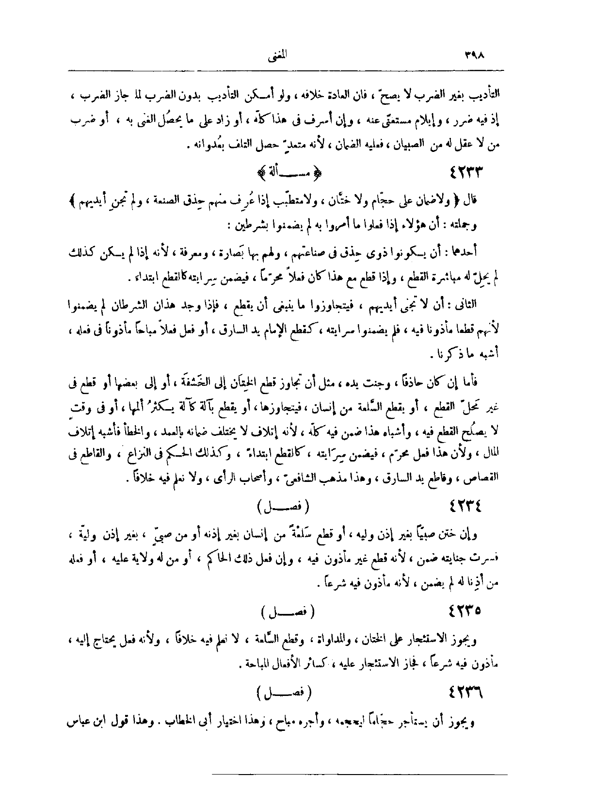 (٤٢٩٤) فَصْلٌ: وَإِنْ خَتَنَ صَبِيًّا بِغَيْرِ إذْنِ وَلِيِّهِ، أَوْ قَطَعَ سِلْعَةً مِنْ إنْسَانٍ بِغَيْرِ إذْنِهِ، أَوْ مِنْ صَبِيٍّ بِغَيْرِ إذْنِ وَلِيِّهِ، فَسَرَتْ جِنَايَتُهُ، ضَمِنَ؛ لِأَنَّهُ قَطْعٌ غَيْرُ مَأْذُونٍ فِيهِ، وَإِنْ فَعَلَ ذَلِكَ الْحَاكِمُ، أَوْ مَنْ لَهُ وِلَايَةٌ عَلَيْهِ، أَوْ فَعَلَهُ مَنْ أَذِنَا لَهُ، لَمْ يَضْمَنْ؛ لِأَنَّهُ مَأْذُونٌ فِيهِ شَرْعًا.