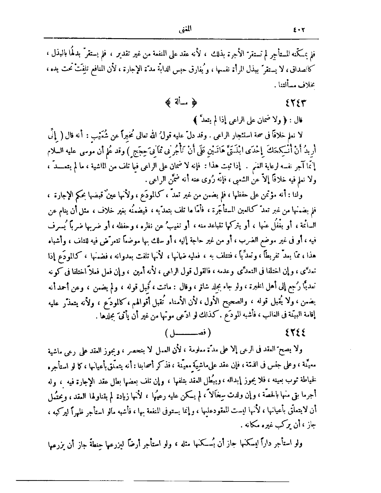 (٤٣٠٣) مَسْأَلَةٌ قَالَ: (وَلَا ضَمَانَ عَلَى الرَّاعِي إذَا لَمْ يَتَعَدَّ) لَا نَعْلَمُ خِلَافًا فِي صِحَّةِ اسْتِئْجَارِ الرَّاعِي، وَقَدْ دَلَّ عَلَيْهِ قَوْلُ اللَّهِ تَعَالَى مُخْبِرًا عَنْ شُعَيْبٍ، أَنَّهُ قَالَ: {إِنِّي أُرِيدُ أَنْ أُنْكِحَكَ إِحْدَى ابْنَتَيَّ هَاتَيْنِ عَلَى أَنْ تَأْجُرَنِي ثَمَانِيَ حِجَجٍ} [القصص: ٢٧] . وَقَدْ عُلِمَ أَنَّ مُوسَى - عَلَيْهِ السَّلَامُ -، إنَّمَا آجَرَ نَفْسَهُ لِرِعَايَةِ الْغَنَمِ. إذَا ثَبَتَ هَذَا، فَإِنَّهُ لَا ضَمَانَ عَلَى الرَّاعِي فِيمَا تَلِفَ مِنْ الْمَاشِيَةِ، مَا لَمْ يَتَعَدَّ، وَلَا نَعْلَمُ فِيهِ خِلَافًا إلَّا عَنْ الشَّعْبِيِّ؛ فَإِنَّهُ رُوِيَ عَنْهُ أَنَّهُ ضَمَّنَ الرَّاعِيَ