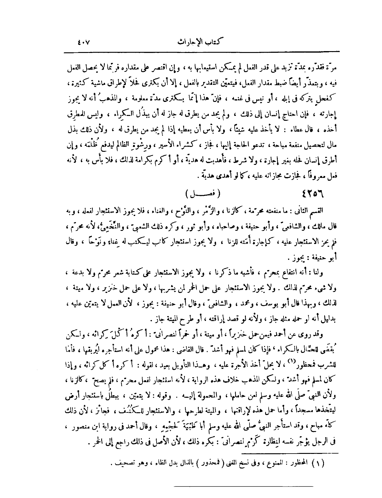 (٤٣١٦) فَصْلٌ: الْقِسْمُ الثَّانِي، مَا مَنْفَعَتُهُ مُحَرَّمَةٌ، كَالزِّنَى وَالزَّمْرِ وَالنَّوْحِ وَالْغِنَاءِ، فَلَا يَجُوزُ الِاسْتِئْجَارُ لِفِعْلِهِ. وَبِهِ قَالَ مَالِكٌ، وَالشَّافِعِيُّ، وَأَبُو حَنِيفَةَ، وَصَاحِبَاهُ، وَأَبُو ثَوْرٍ. وَكَرِهَ ذَلِكَ الشَّعْبِيُّ، وَالنَّخَعِيُّ؛ لِأَنَّهُ مُحَرَّمٌ، فَلَمْ يَجُزْ الِاسْتِئْجَارُ عَلَيْهِ، كَإِجَارَةِ أَمَتِهِ لِلزِّنَى. وَلَا يَجُوزُ اسْتِئْجَارُ كَاتِبٍ لِيَكْتُبَ لَهُ غِنَاءً وَنَوْحًا. وَقَالَ أَبُو حَنِيفَةَ: يَجُوزُ